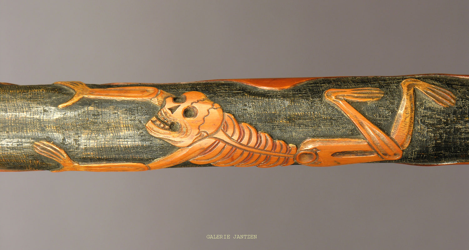 Canne constituée d’un bambou monoxyle sur lequel est sculpté deux squelettes entiers. L’un des deux tient des baguettes et semblent vouloir s’apprêter à prendre le bol plein de riz, tandis que l’autre squelette semble mécontent car il voudrait attraper ce bol, une théière et un bol se trouvent au bas de la canne.