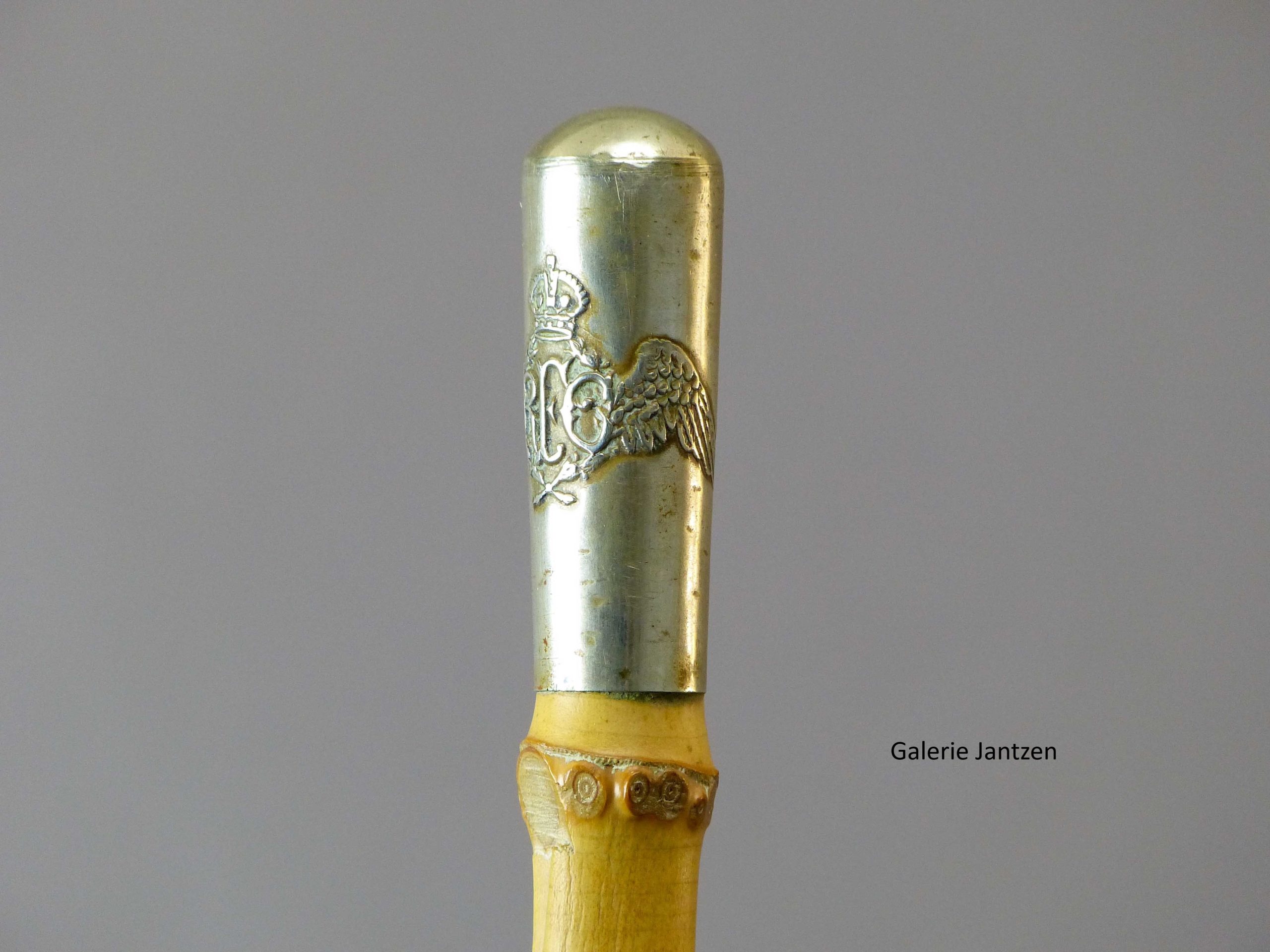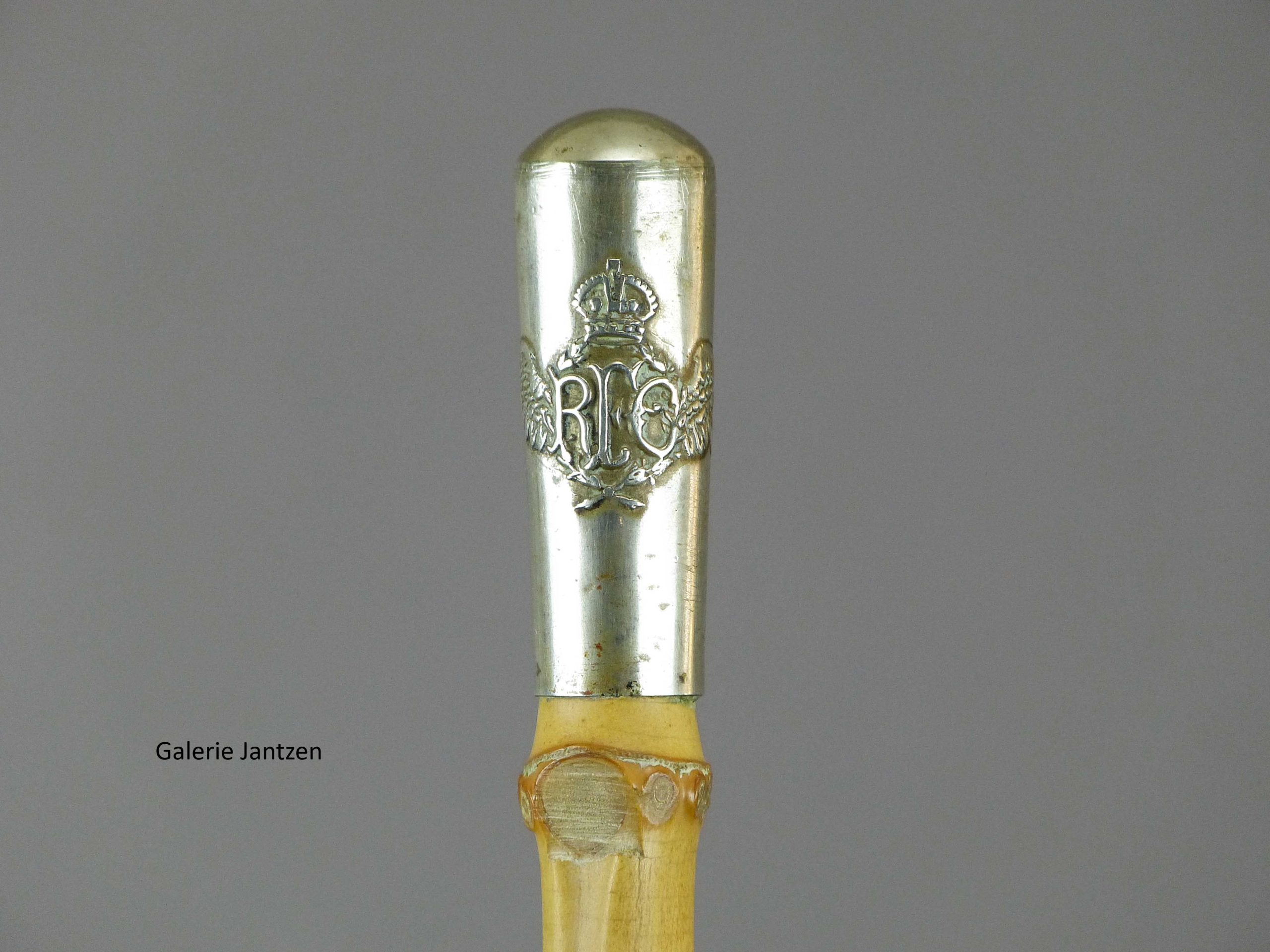 Le pommeau de forme Milord en métal arbore l’écusson de la « Royal Flying Corporation » avec une paire d’ailes encadrant les lettres » RFC » et au dessus la couronne du Roi Georges V.