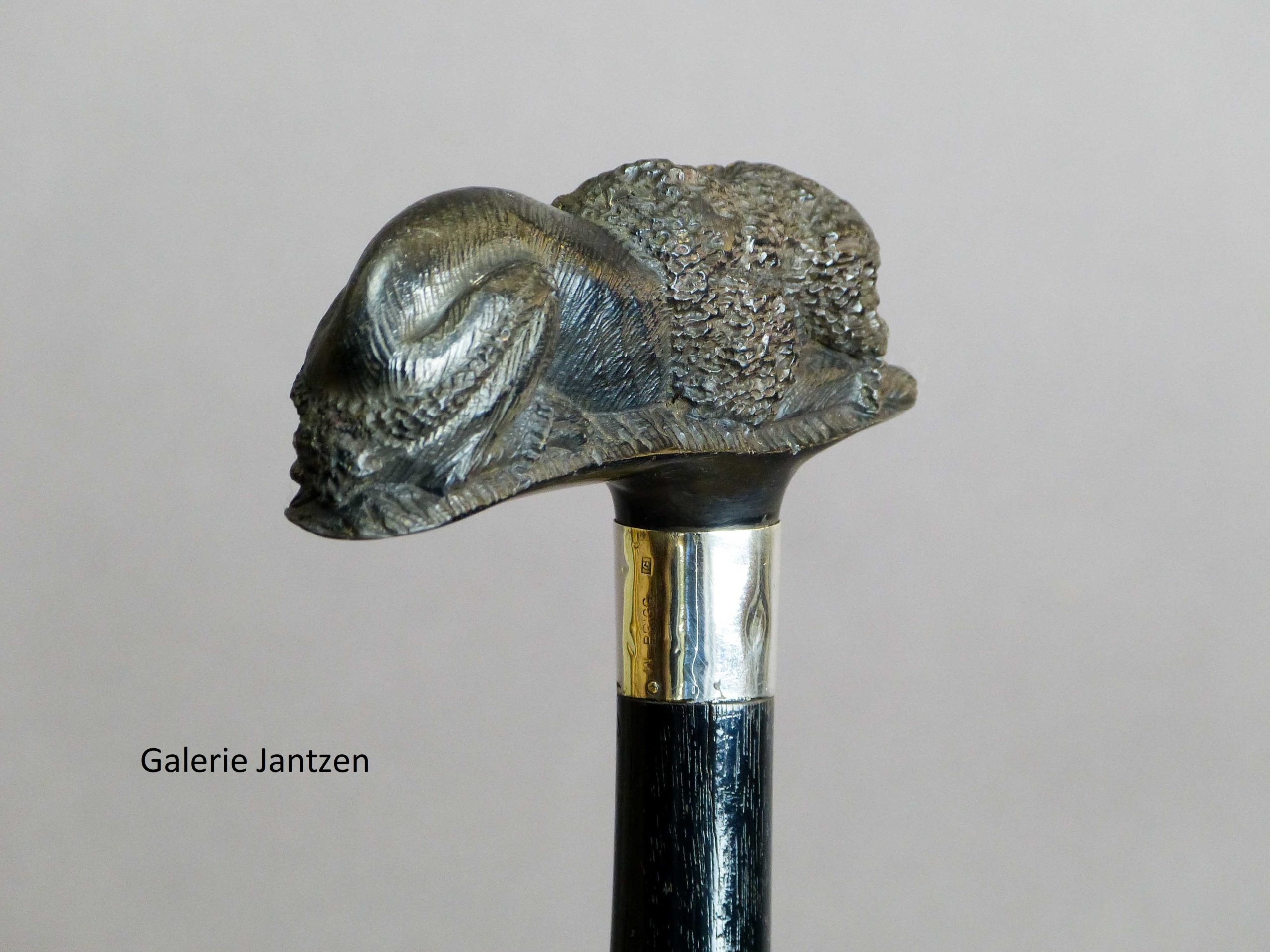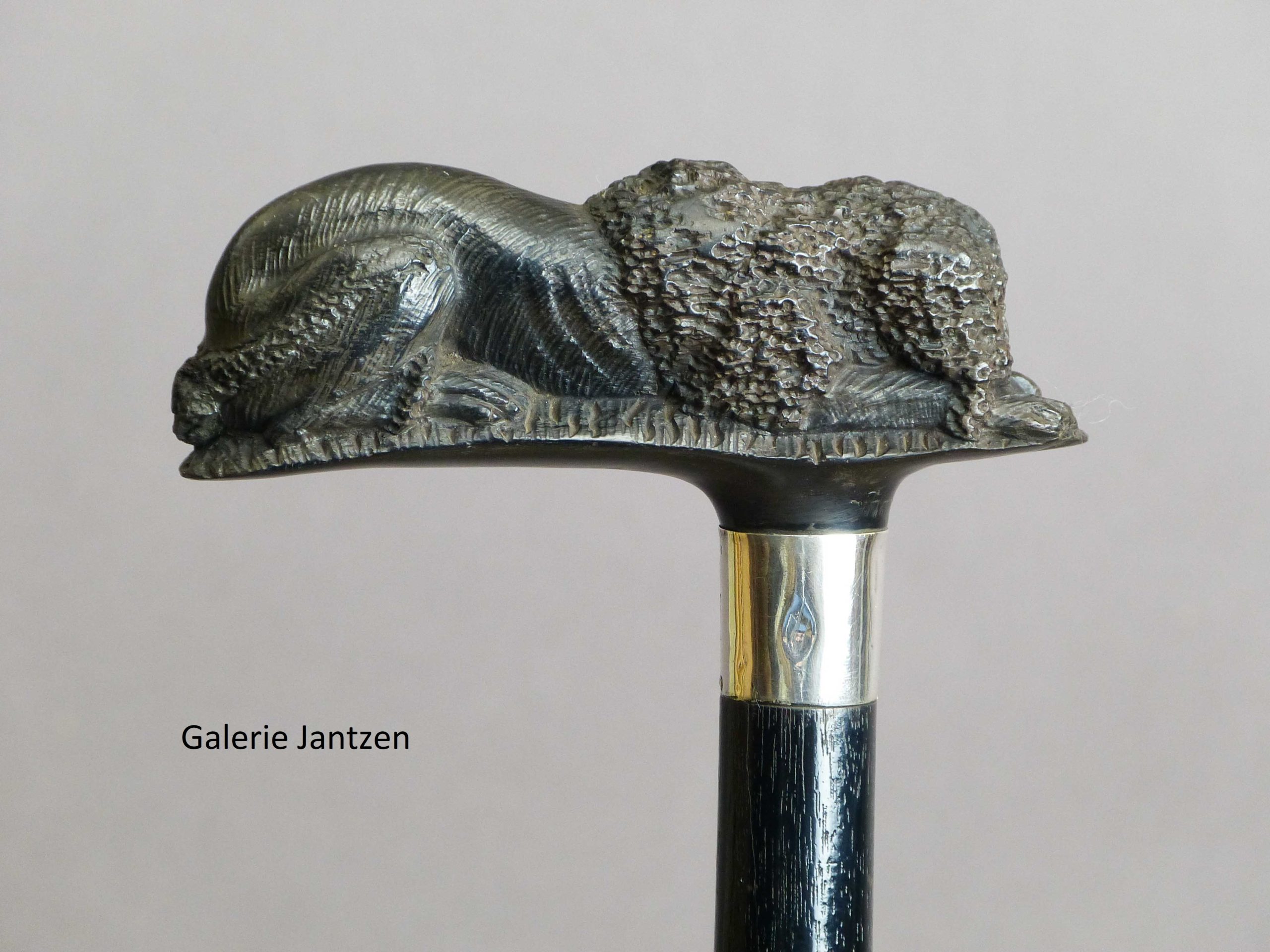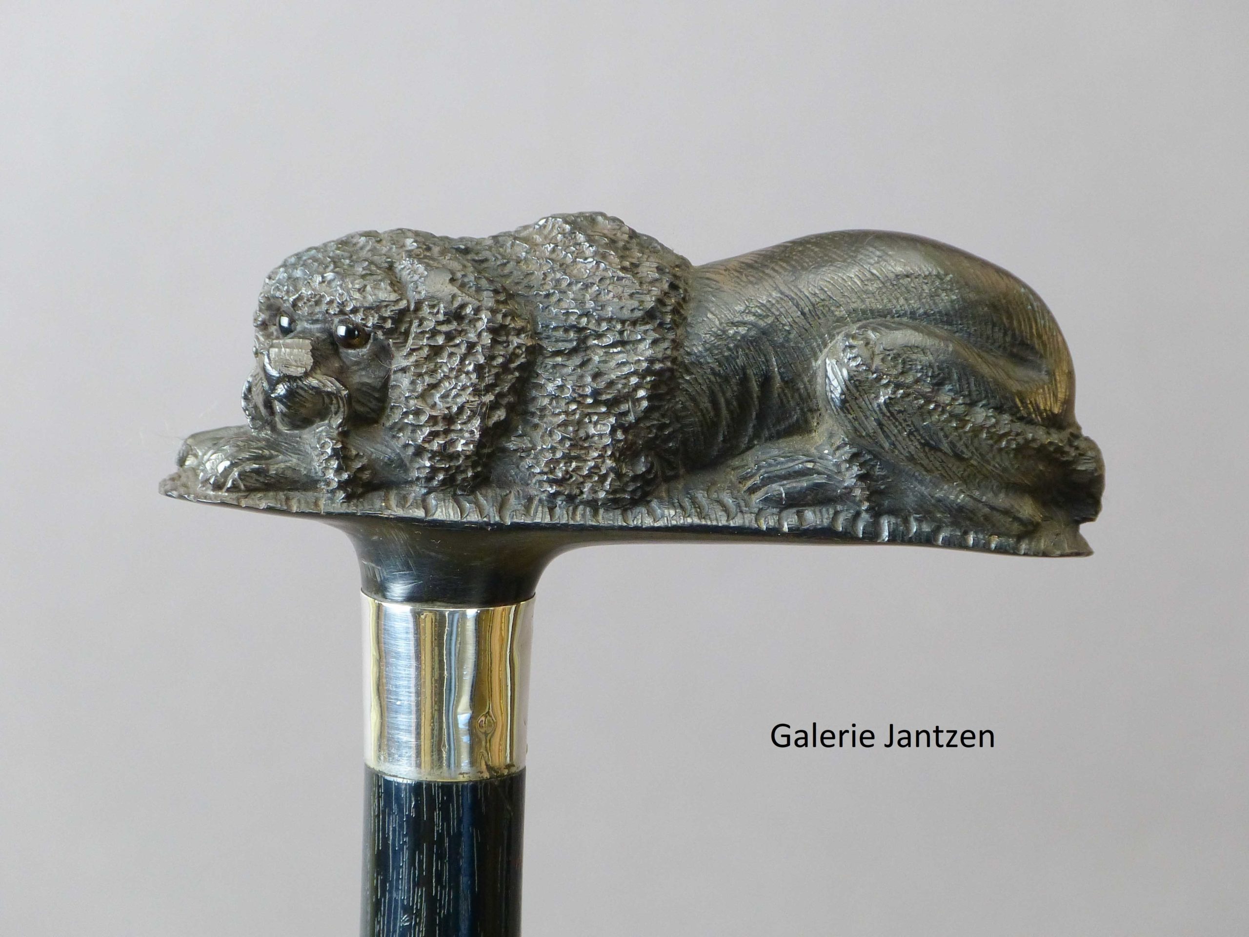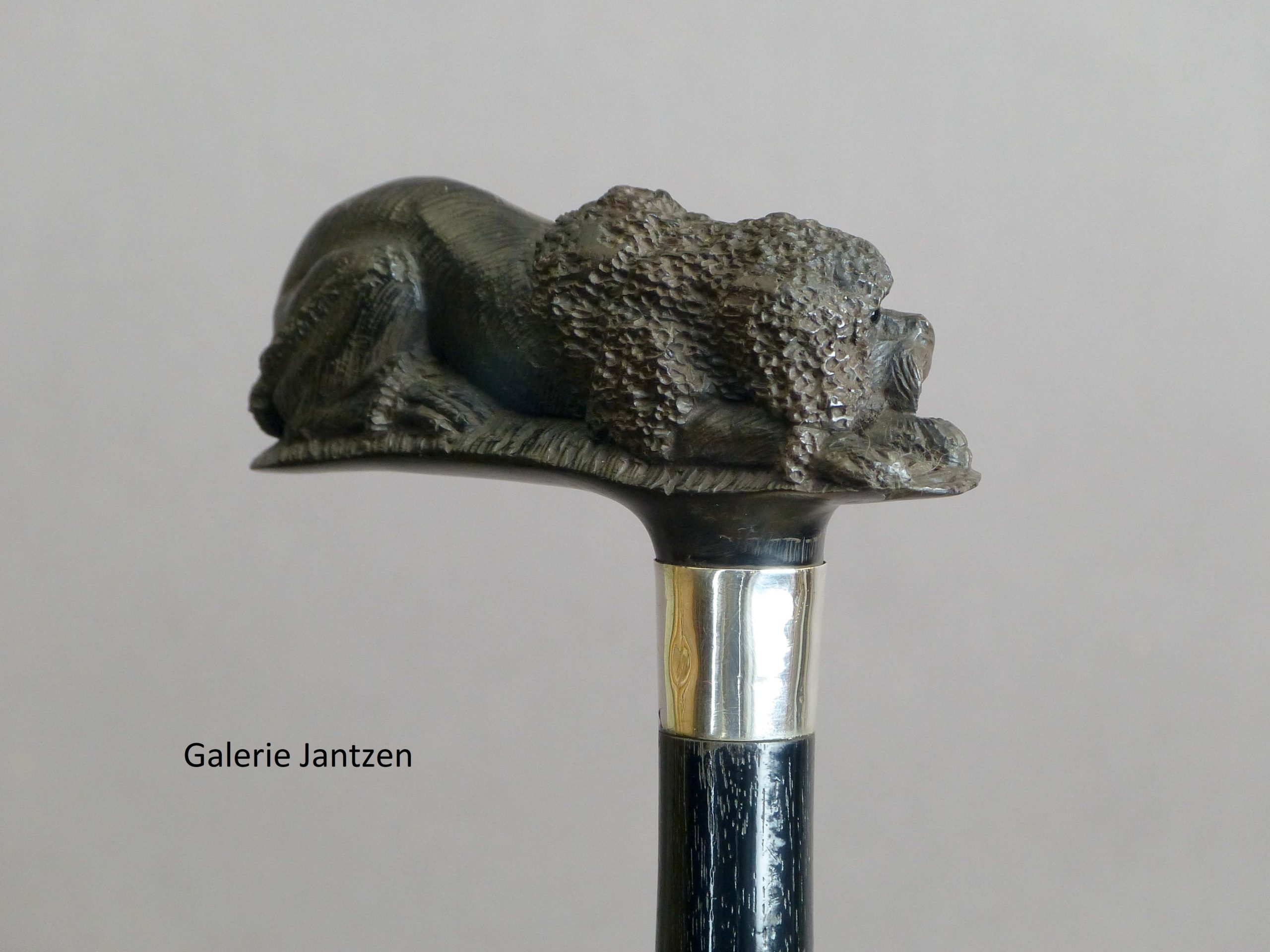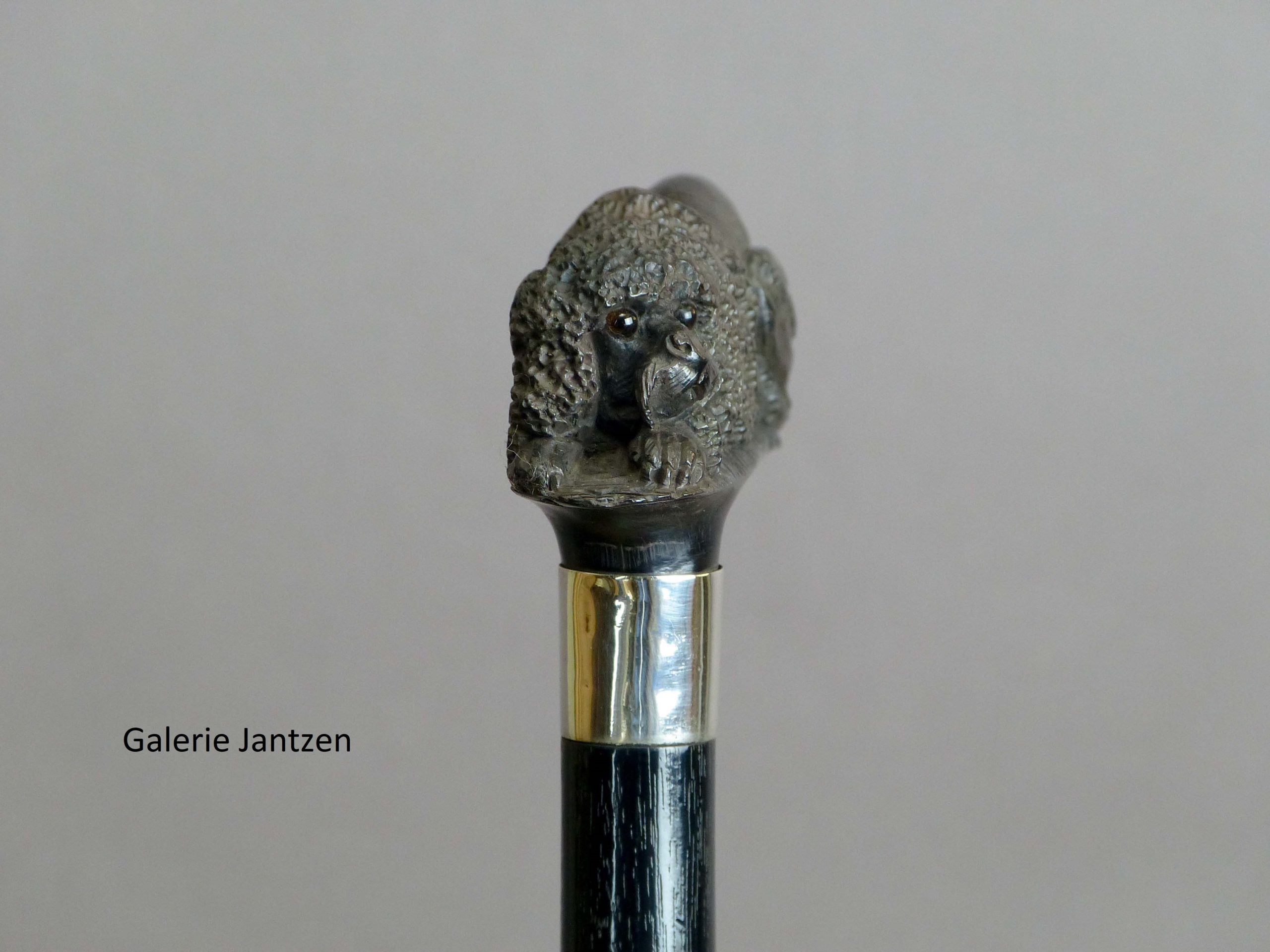 Canne décorative dont le pommeau est de forme équerre sculpté d’un Caniche Royal en ébène, la tête orientée vers la gauche. Ses yeux marrons sont en verres et sa posture est couché. Il arbore un toilettage « coupe lion » qui consiste à couper à ras les poils des membres et de l’arrière train, à sculpter des pompons au niveau des pattes et de la queue et laisser, la tête, la poitrine et le ventre recouverts de poils.