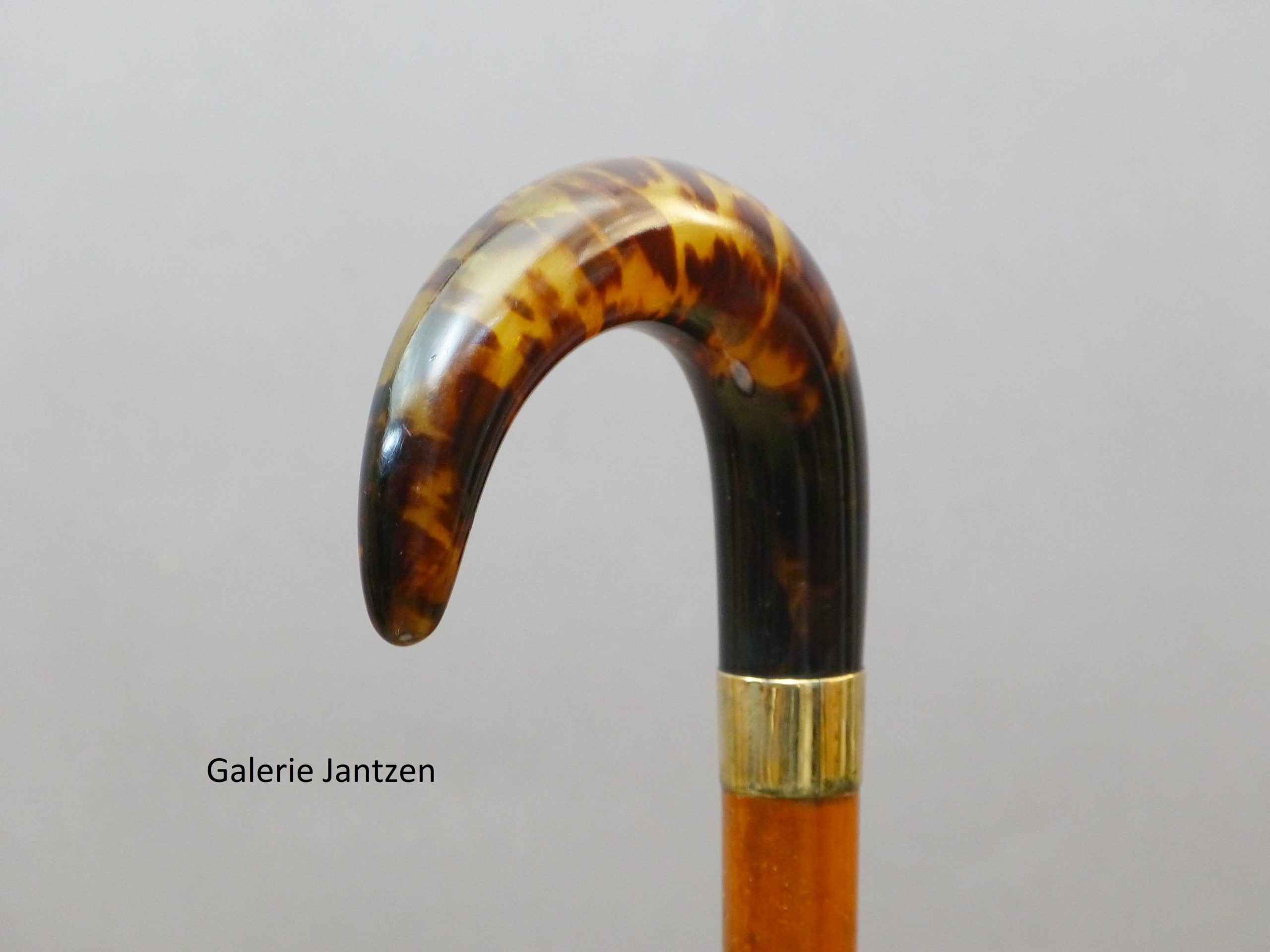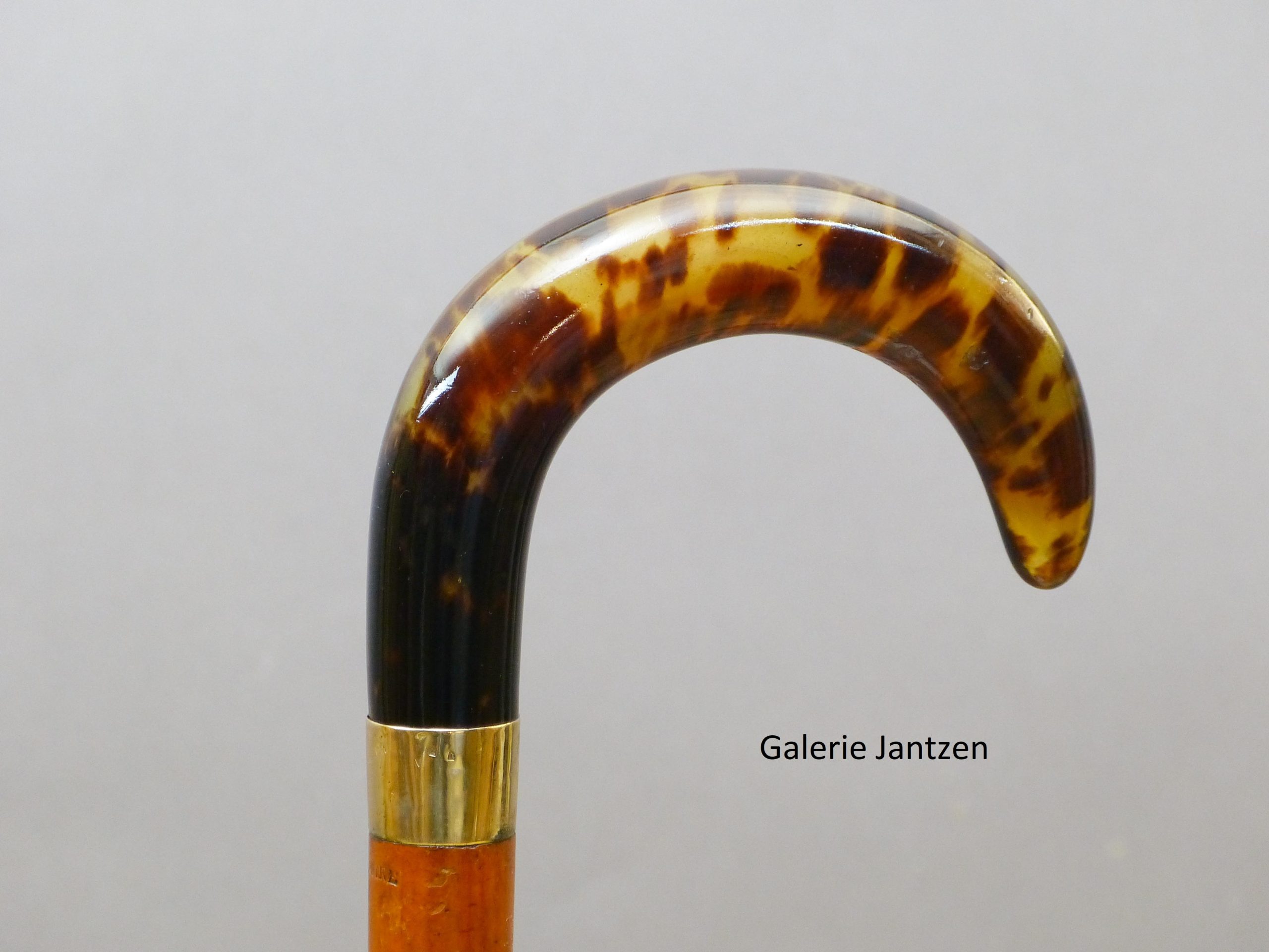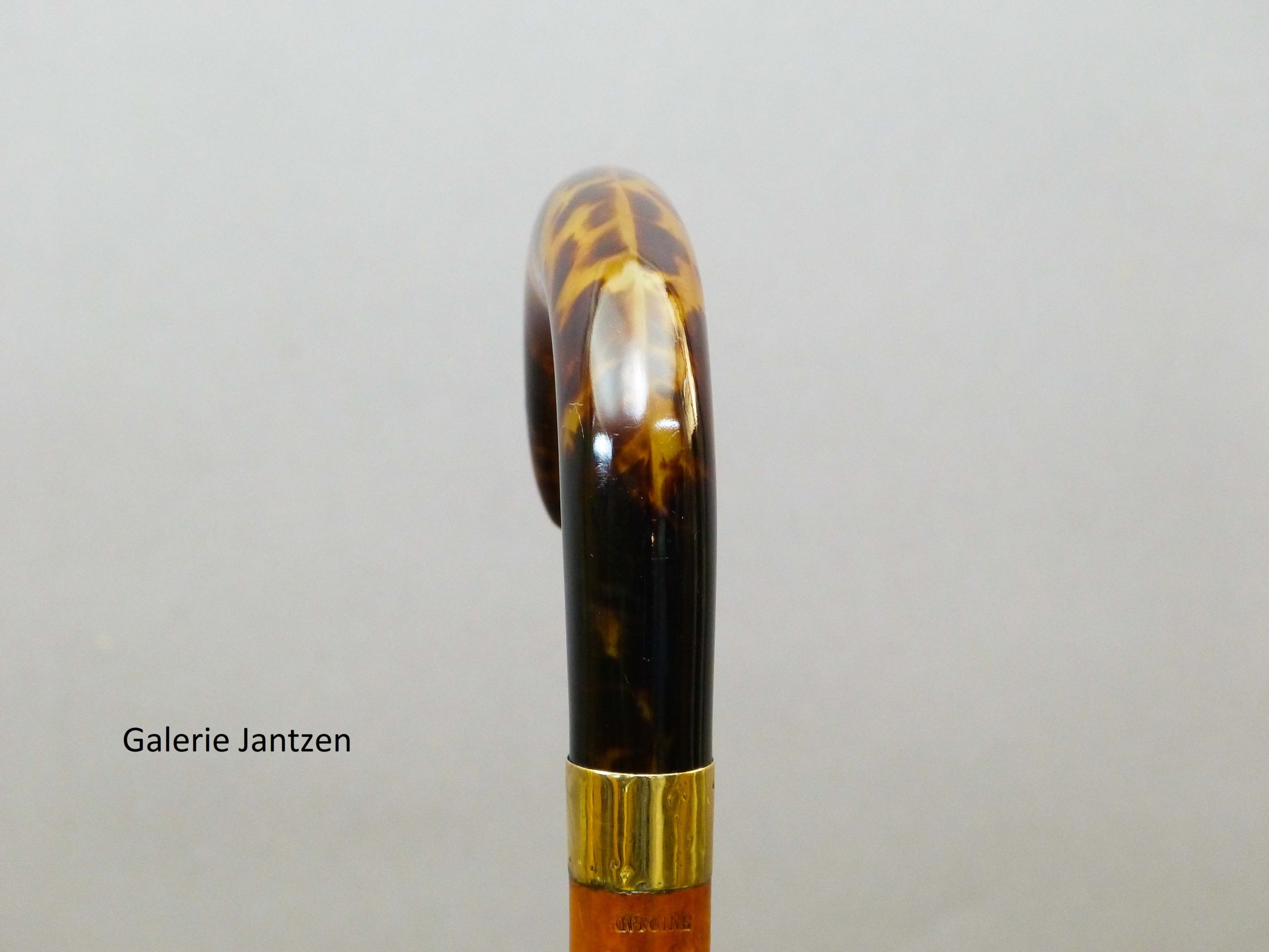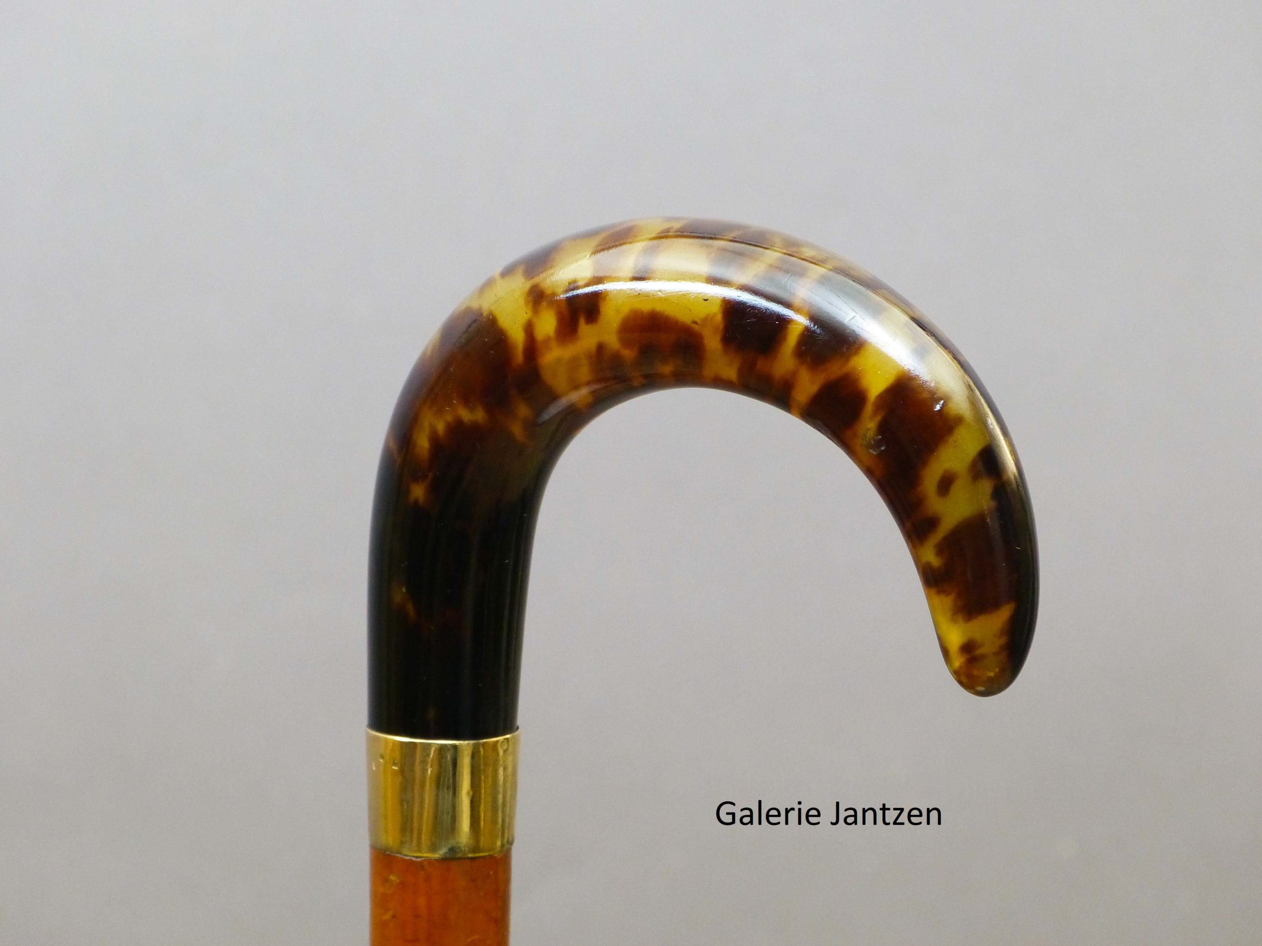 Élégante canne de promenade à poignée courbe en écaille de tortue plaquée sur corne de bélier, monté sur une bague en métal dorée et sur un fût en Jonc de Malacca portant l’inscription ANTOINE, férule en métal. Cette canne peut être utilisé en canne d’appui. Le jonc de Malacca la rend extrêmement souple.