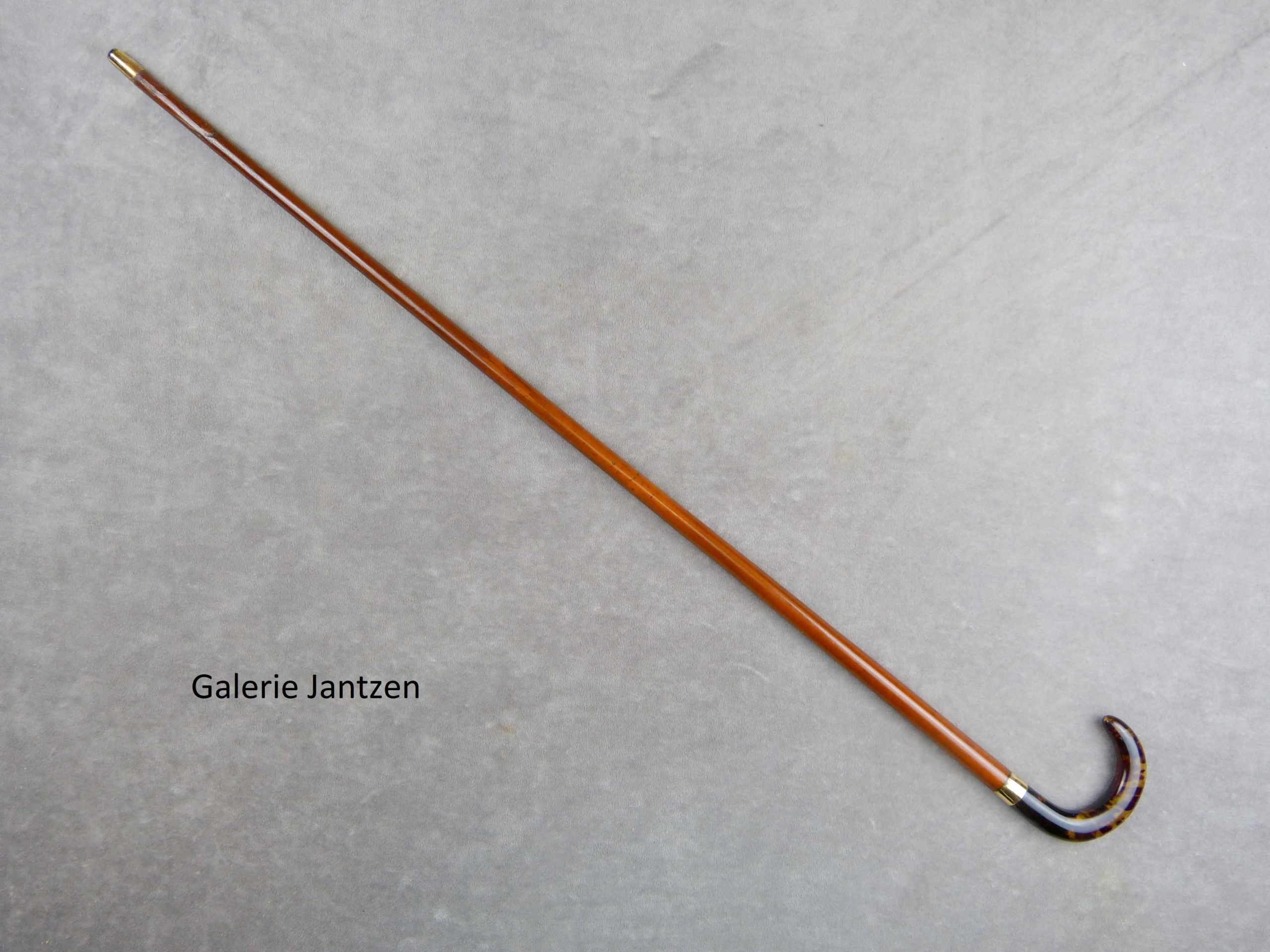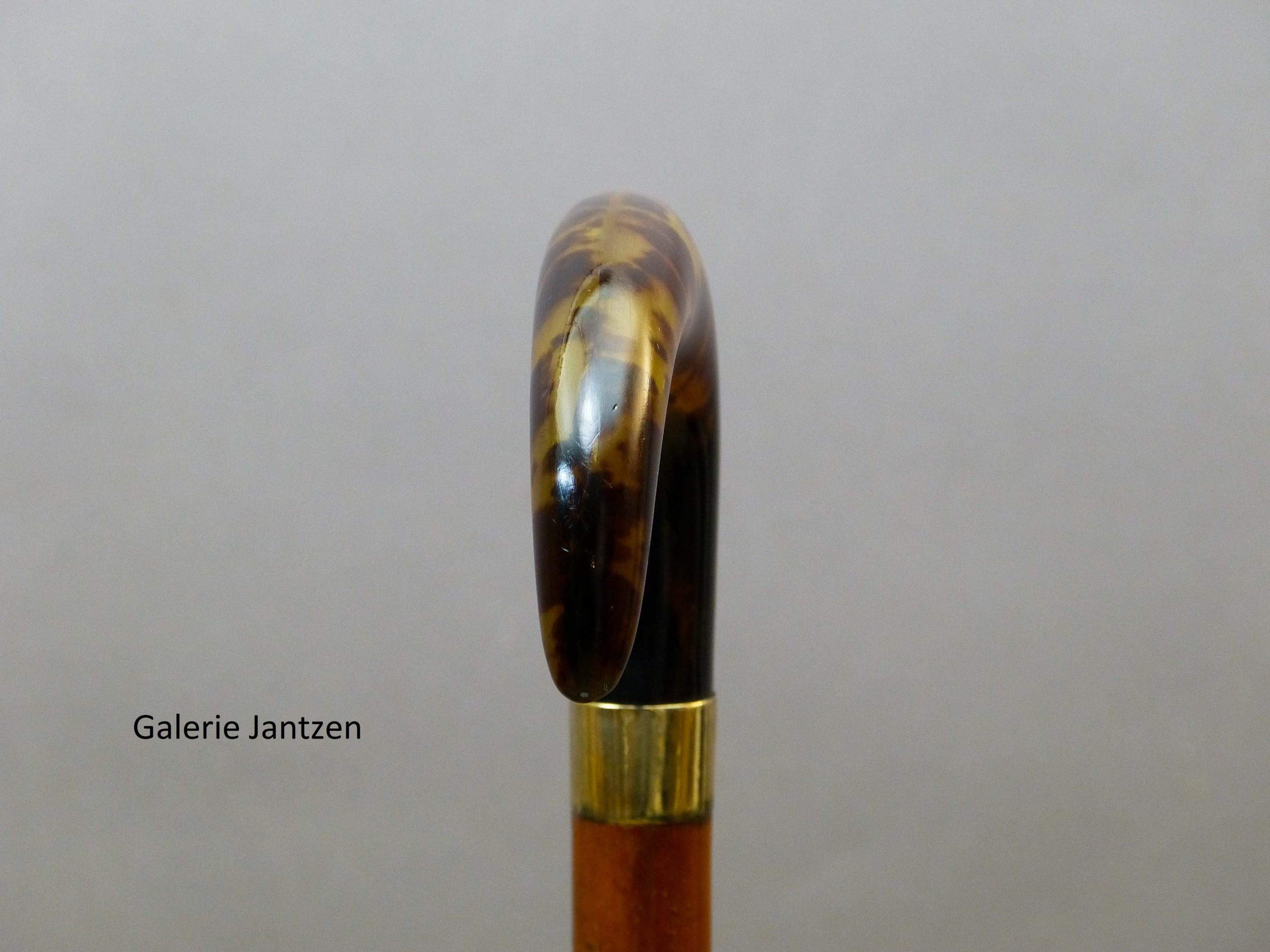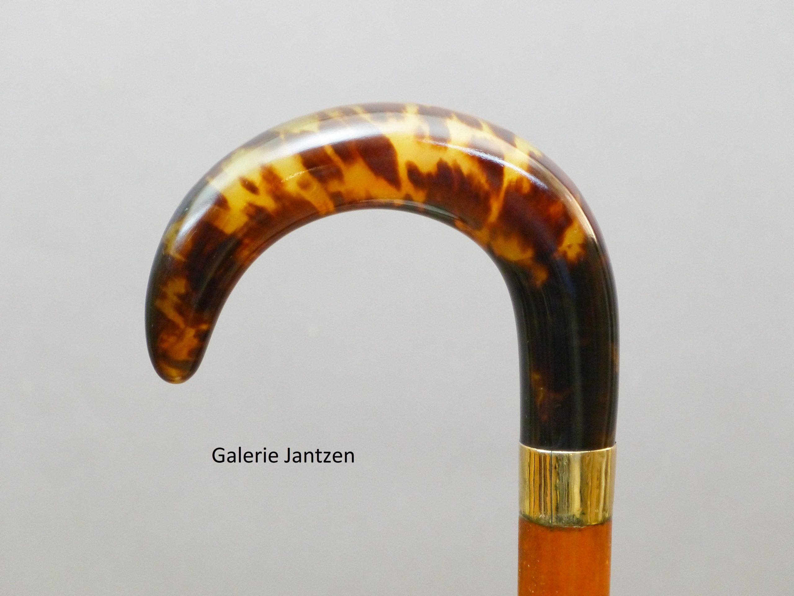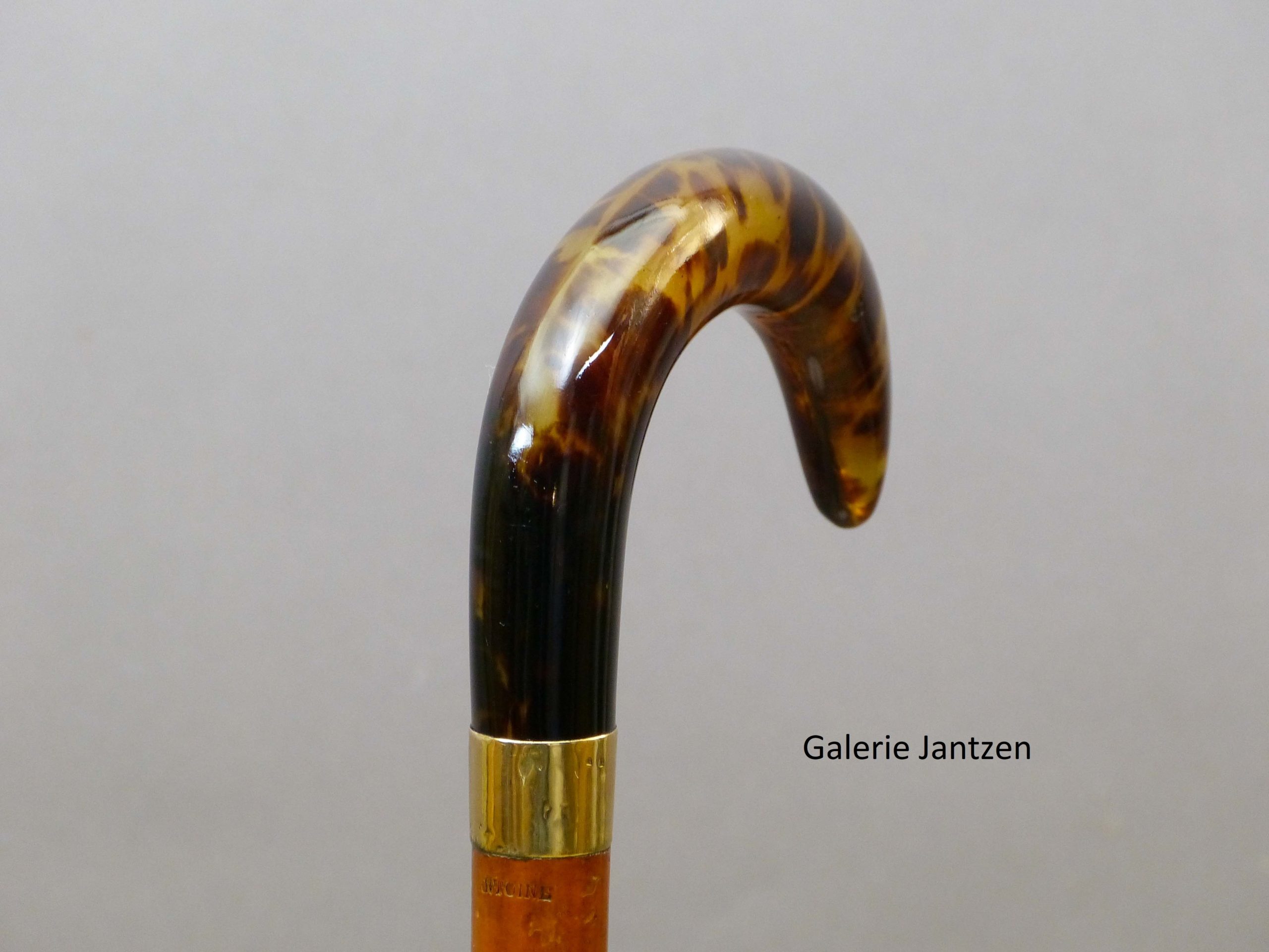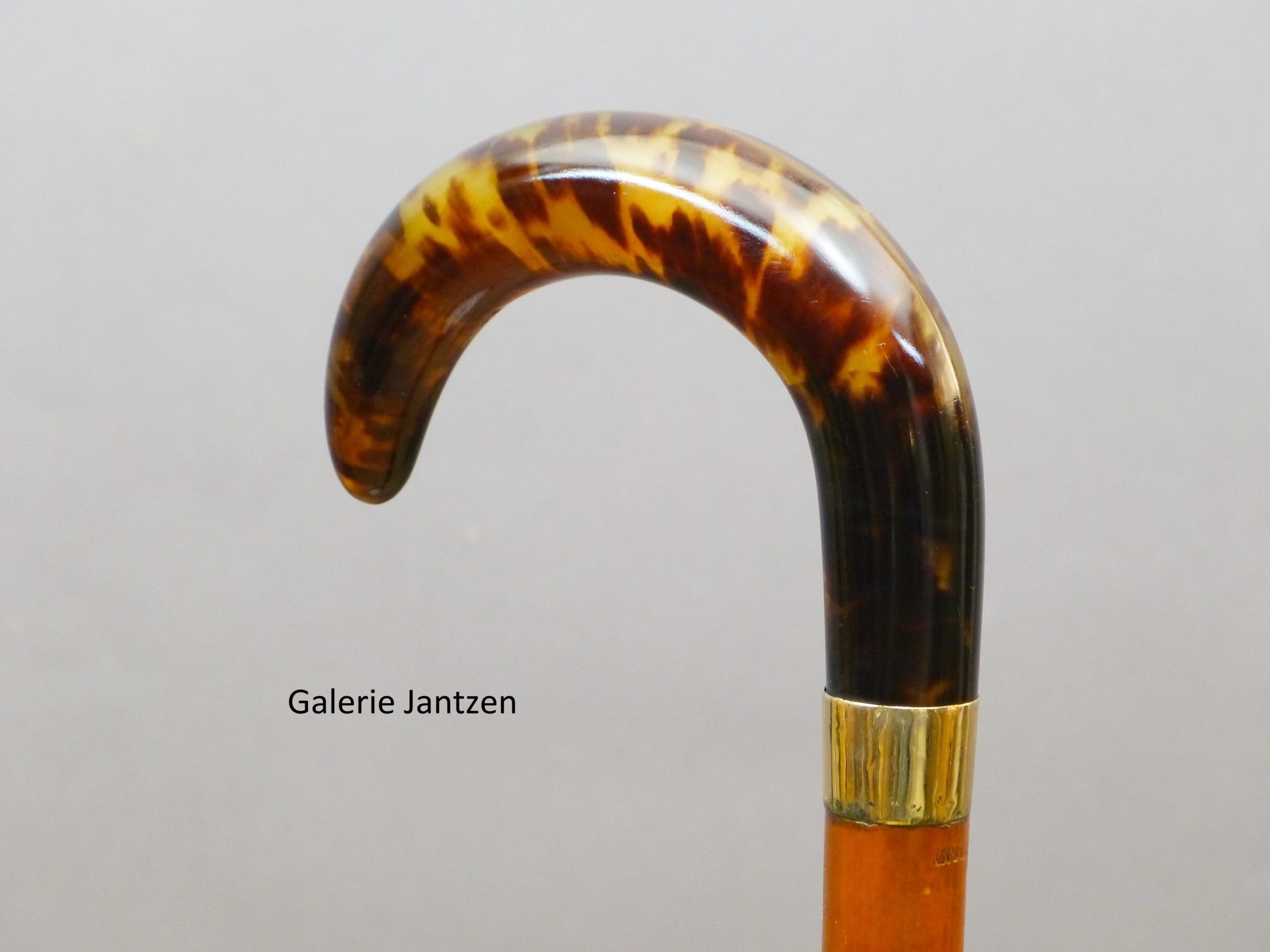 Élégante canne de promenade à poignée courbe en écaille de tortue plaquée sur corne de bélier, monté sur une bague en métal dorée et sur un fût en Jonc de Malacca portant l’inscription ANTOINE, férule en métal. Cette canne peut être utilisé en canne d’appui. Le jonc de Malacca la rend extrêmement souple.
