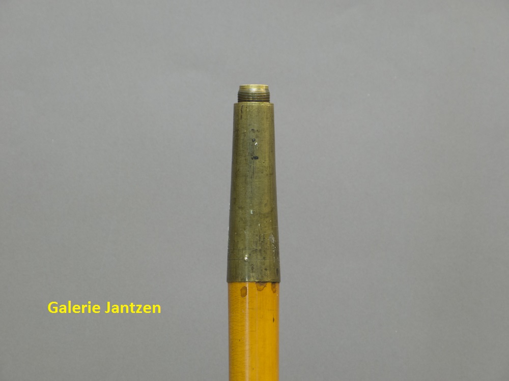 Exceptionnelle canne longue vue XVIIIeme dont le pommeau de forme Milord en pomponne se visse sur un haut fût en jonc mâle de Malacca, grande férule en laiton se dévissant.