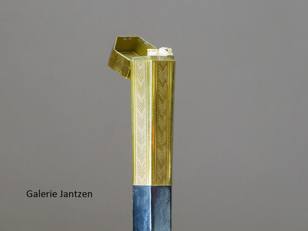 Canne à système de fumeur constitué d’un pommeau de forme Milord à 6 pans en laiton ciselé à chevrons. Il s’ouvre par un bouton poussoir situé sur la tranche et contient 5 à 6 cigarettes.