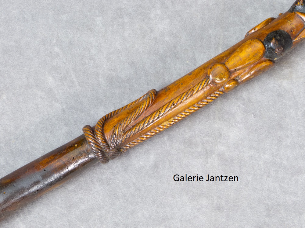 Canne monoxyle d’Art populaire sculpté autour de deux thèmes:
