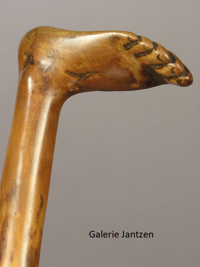 Canne d’art populaire monoxyle en aubépine dont le pommeau pris dans l’ébauchon est sculpté d’un pied gauche.