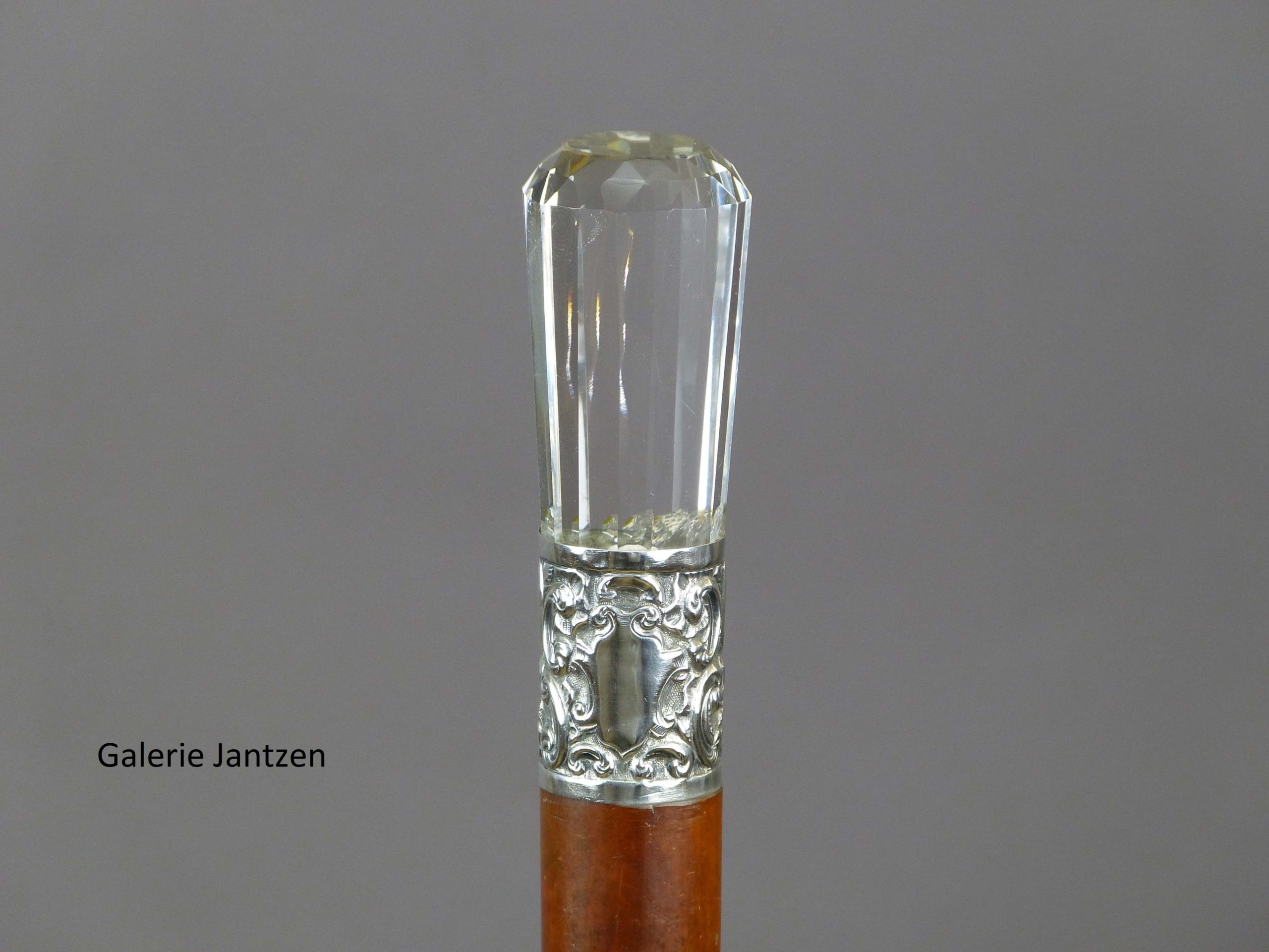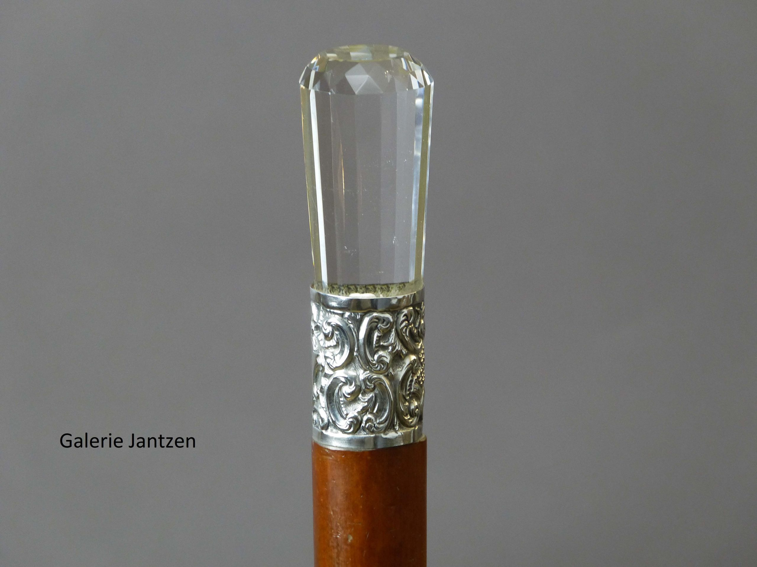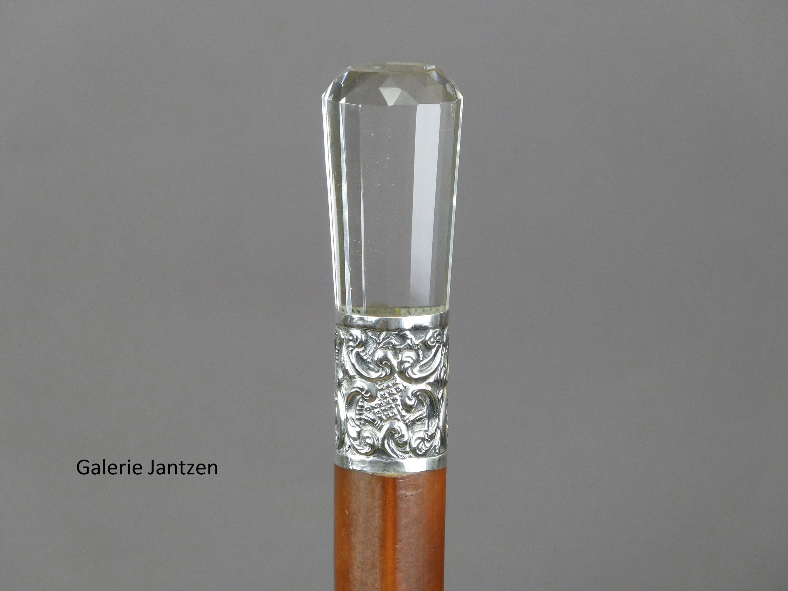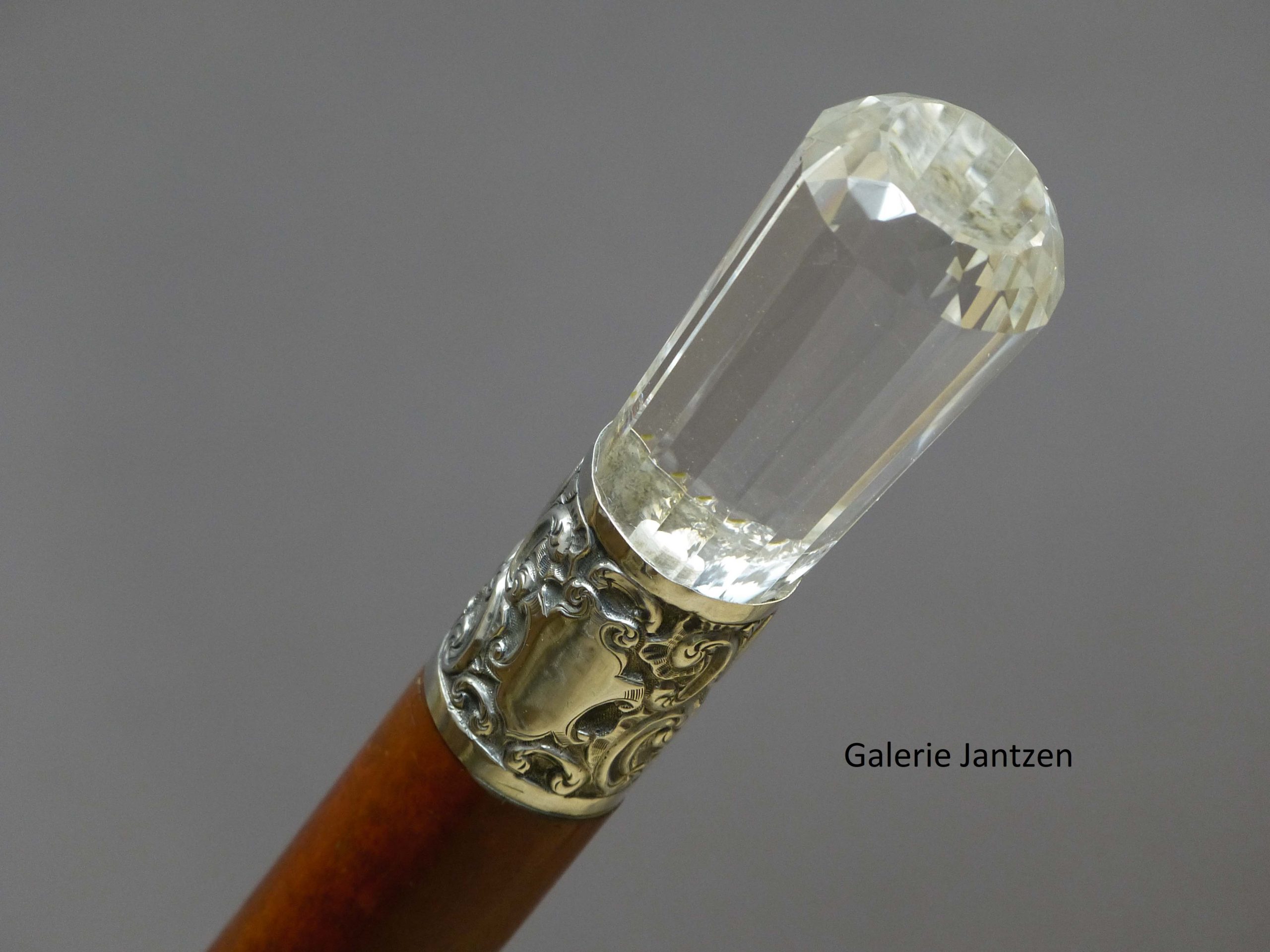 Canne de Dandy à pommeau de forme Milord en Cristal de Roche taillé à facettes ce qui fait jouer la lumière. Le pommeau est monté sur une haute bague en argent ciselée de volutes avec en son centre un écusson pour y faire graver le chiffre du propriétaire. Cette canne était principalement utilisée lors d’élégante soirée.