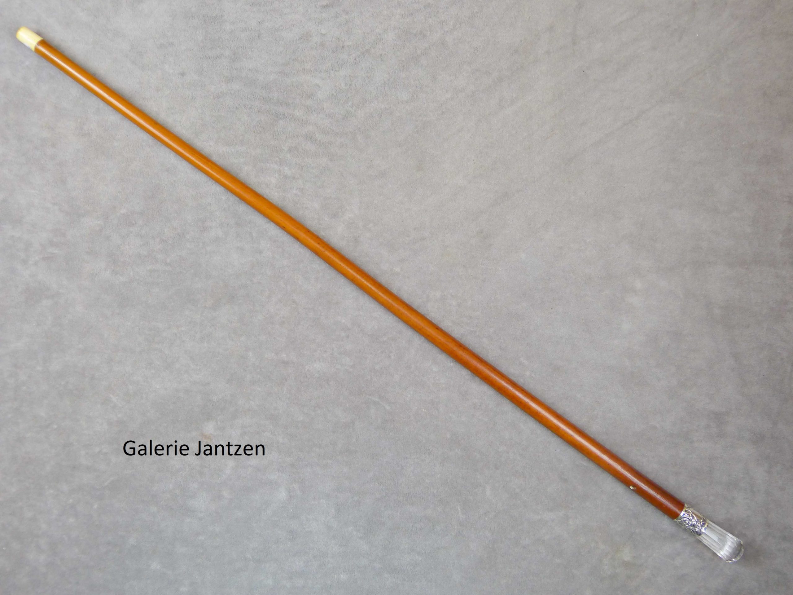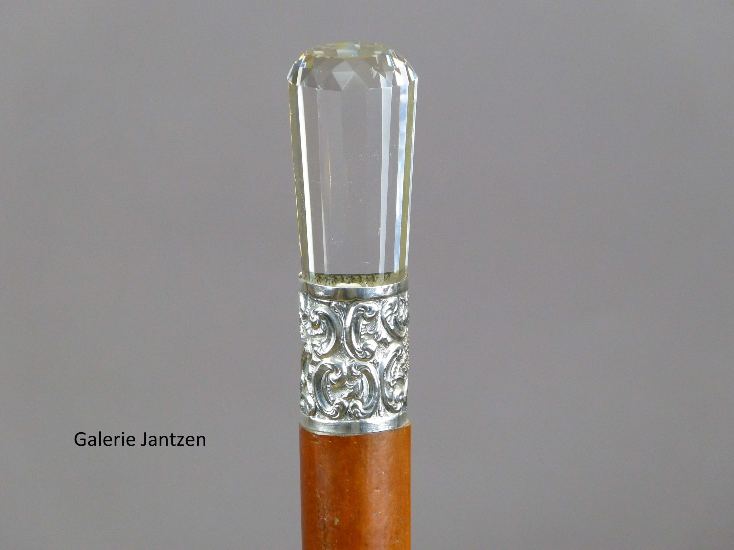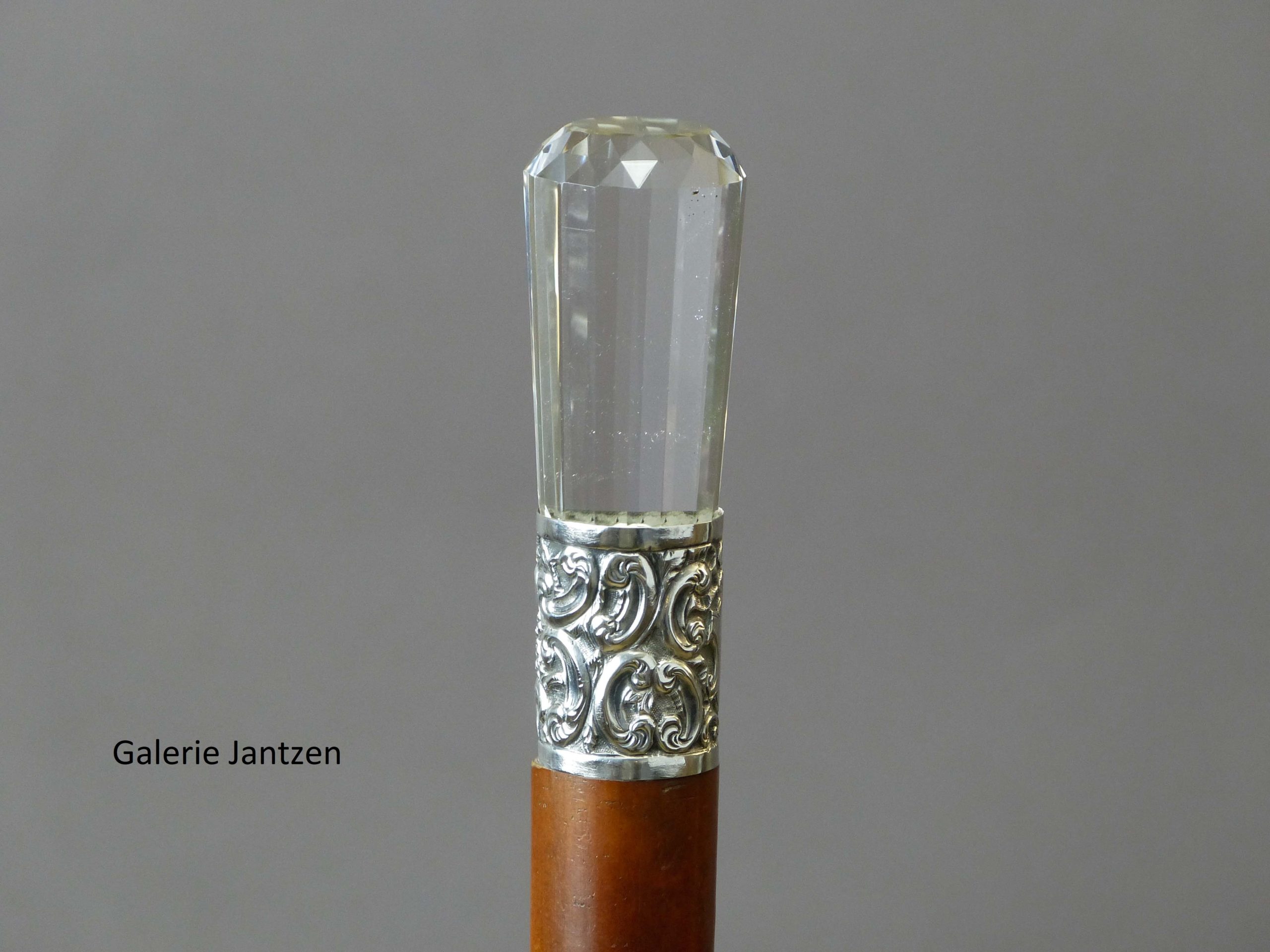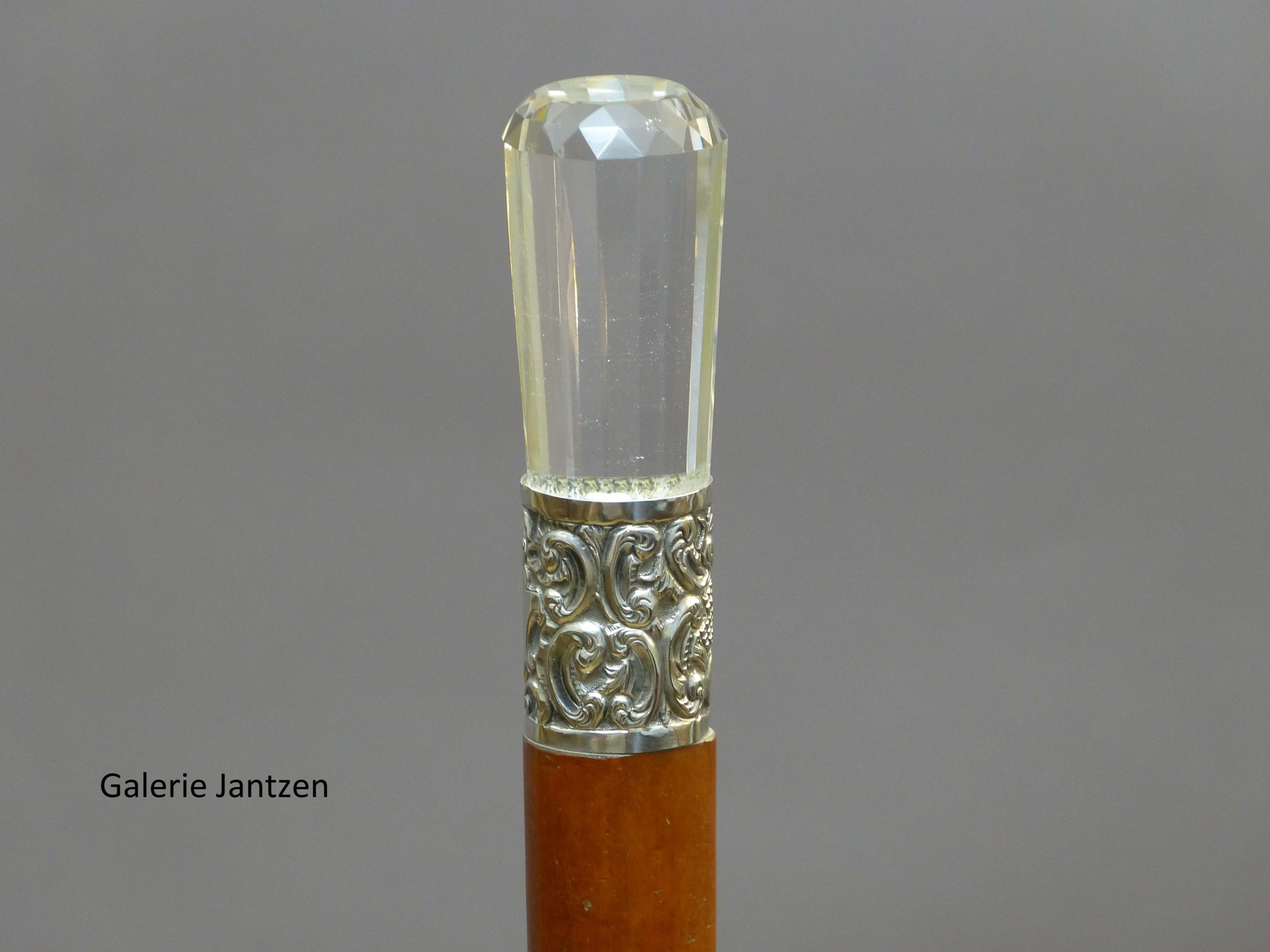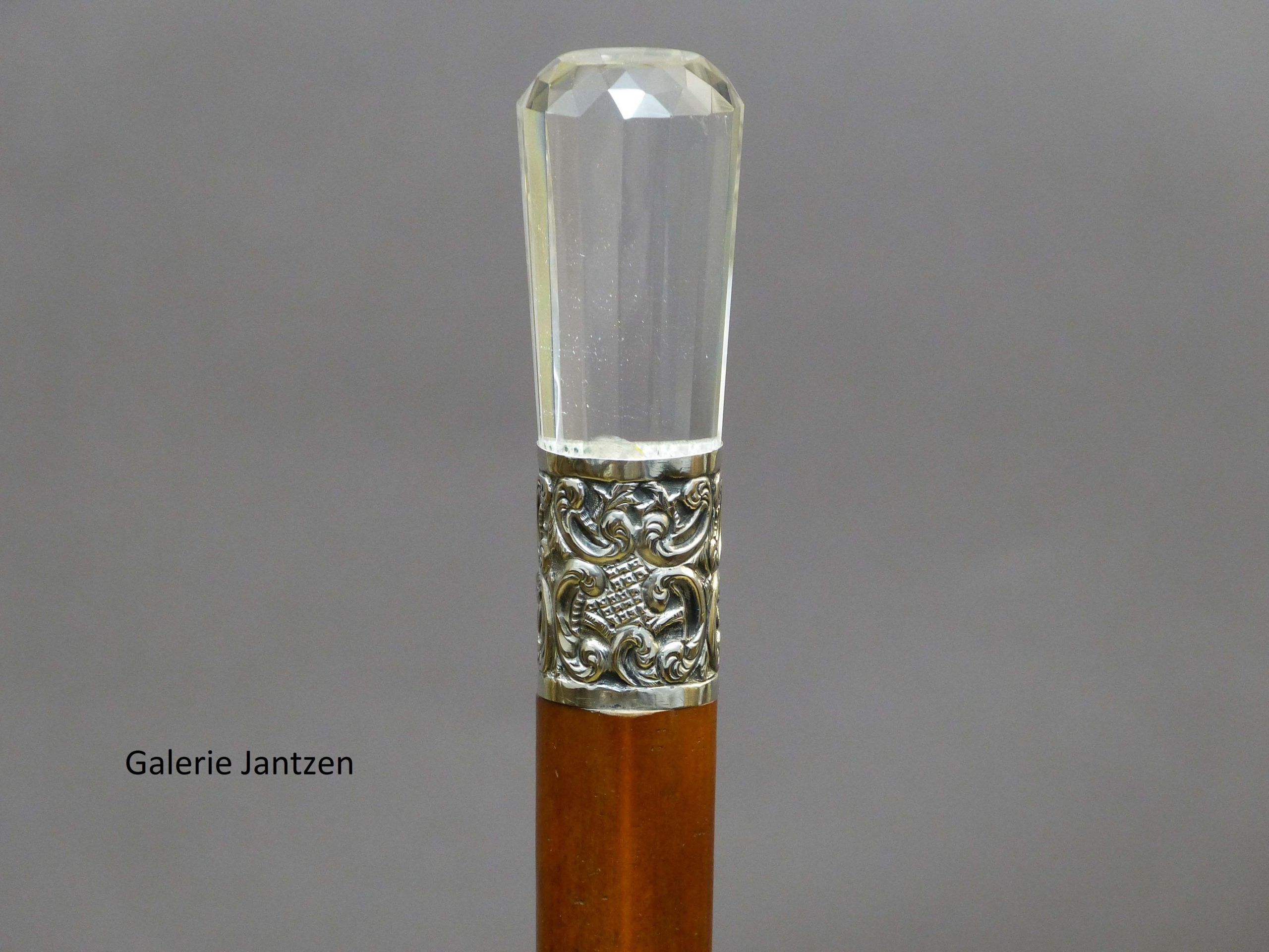 Canne de Dandy à pommeau de forme Milord en Cristal de Roche taillé à facettes ce qui fait jouer la lumière. Le pommeau est monté sur une haute bague en argent ciselée de volutes avec en son centre un écusson pour y faire graver le chiffre du propriétaire. Cette canne était principalement utilisée lors d’élégante soirée.