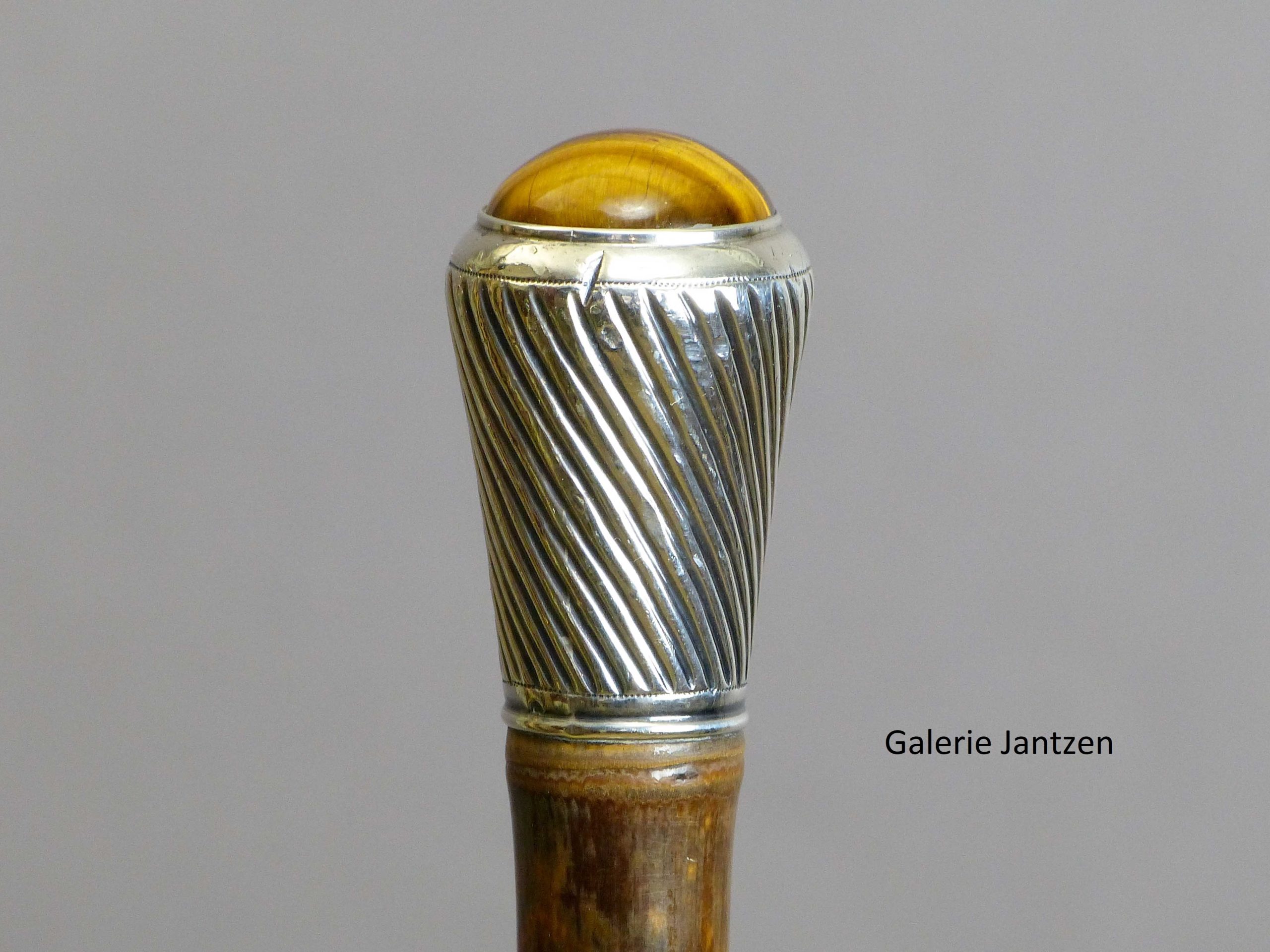 Fine canne du soir à pommeau Milord en argent à motif strié rehaussé sur le dessus d’un cabochon en œil de tigre.