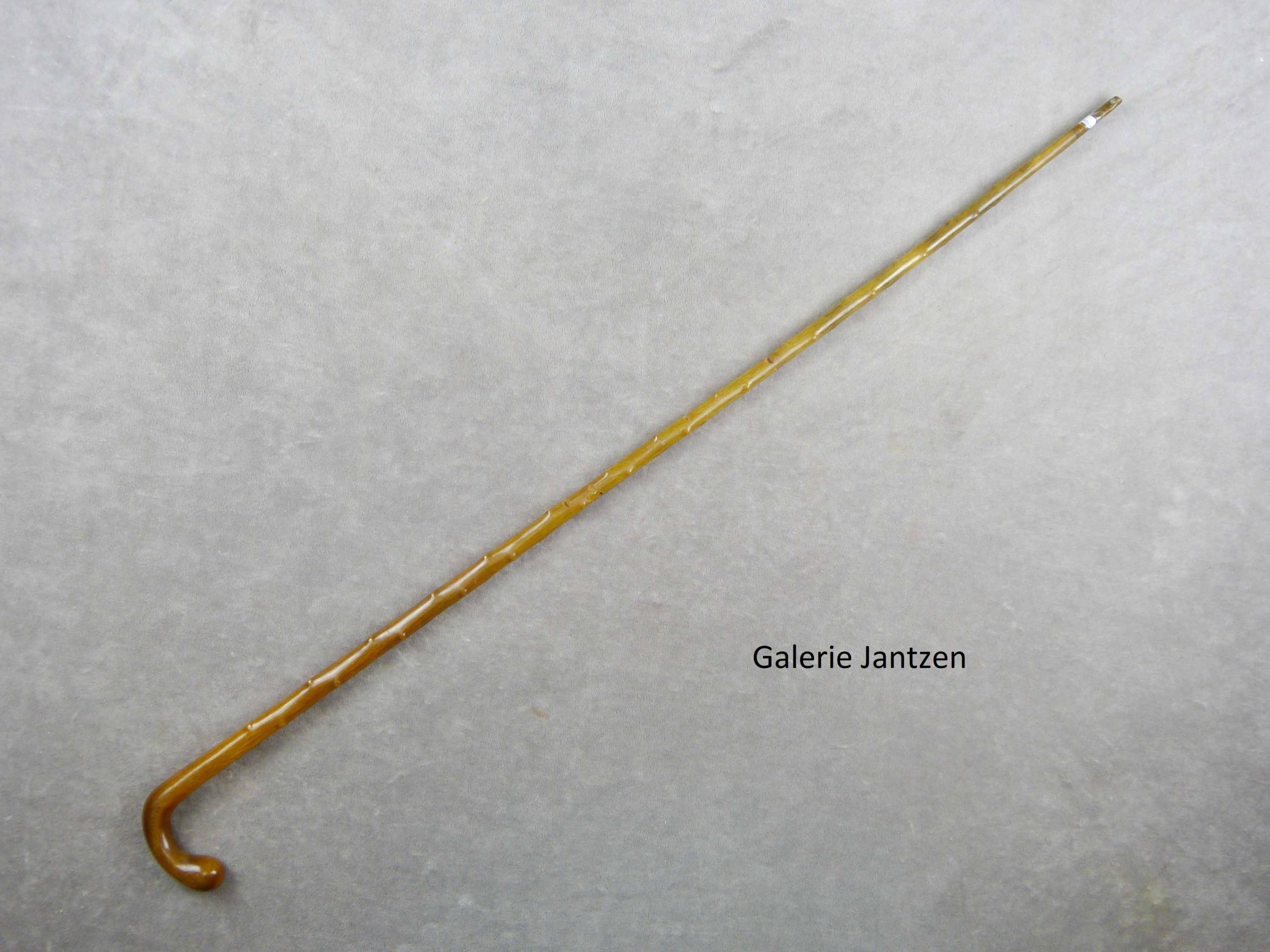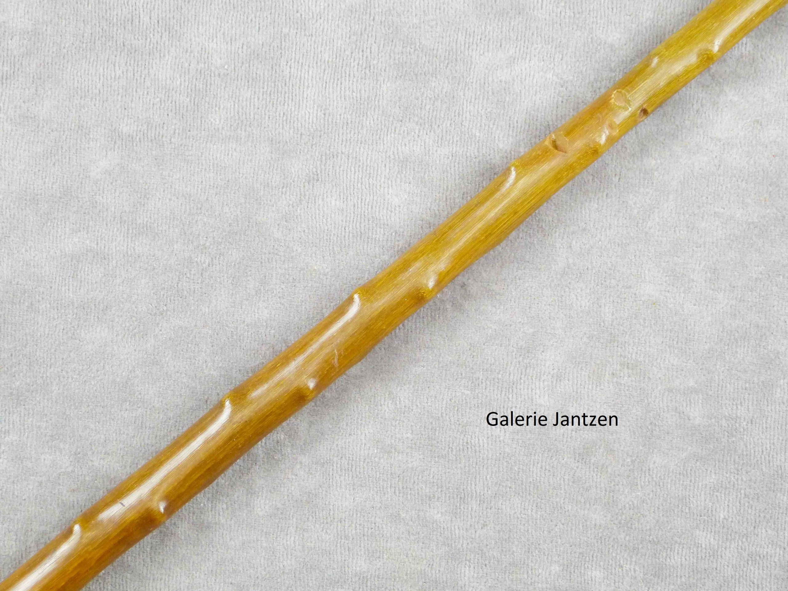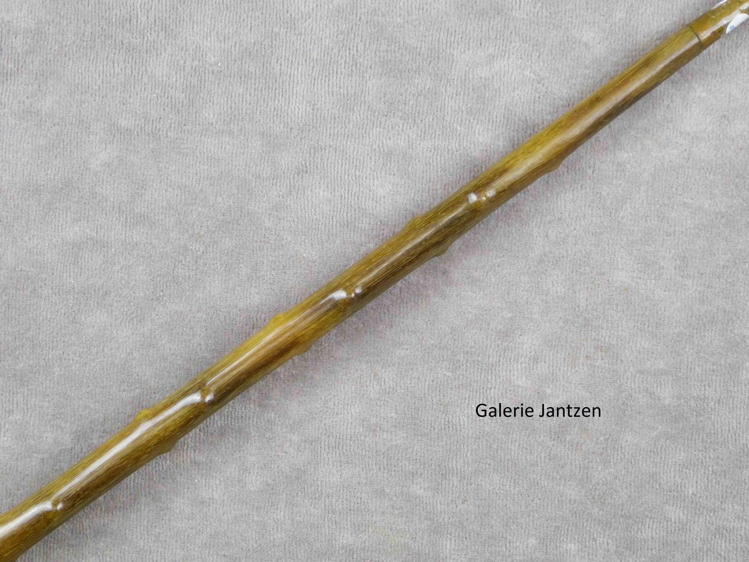 Canne monoxyle de forme conique et pommeau de forme Équerre en corne de Rhinocéros, sculptée façon épine. La canne est bien protégée dans son coffret d’origine en bois, gainé de tissu rouge, disposant de 4 crochets de fermeture sur la tranche.