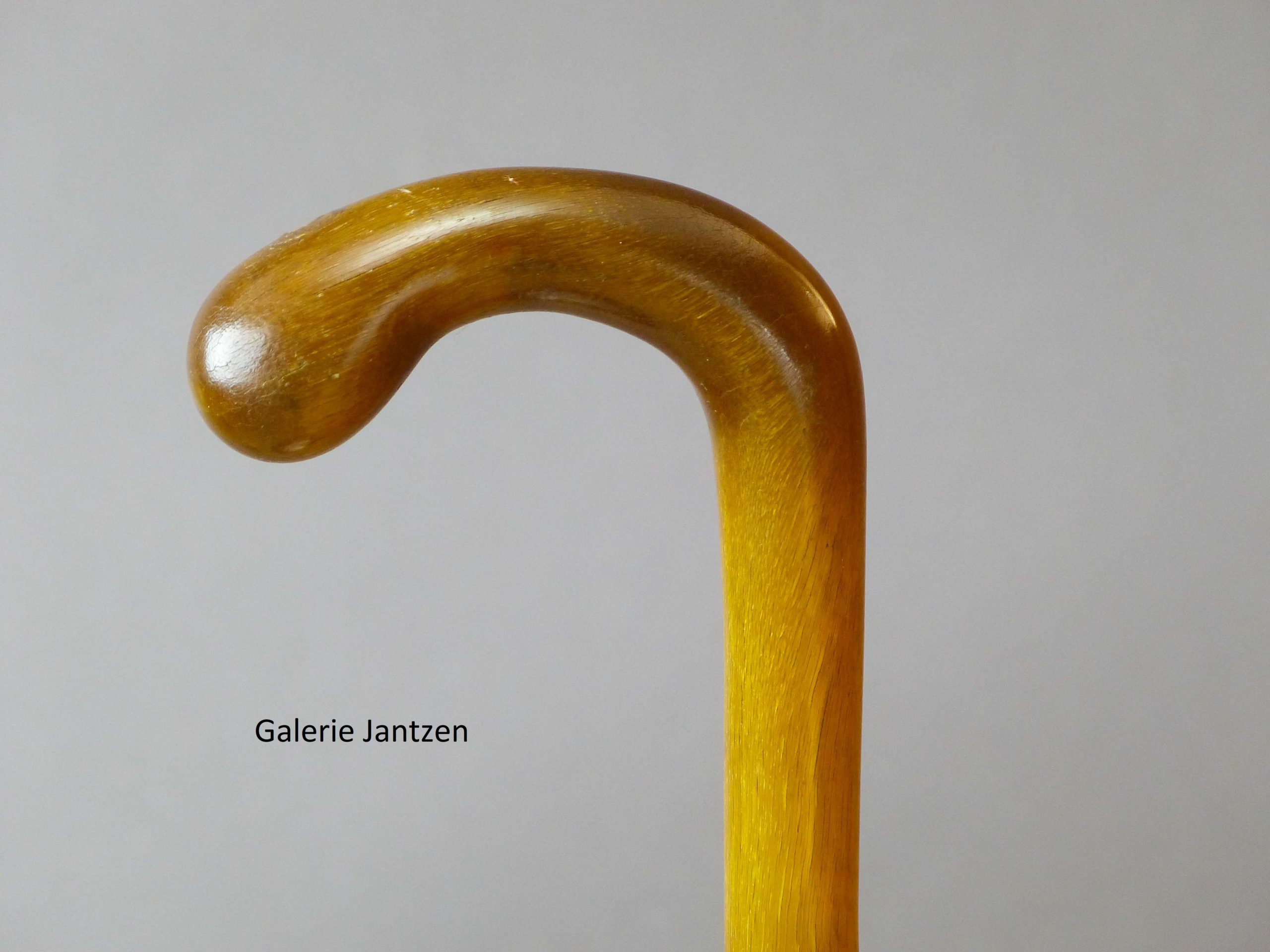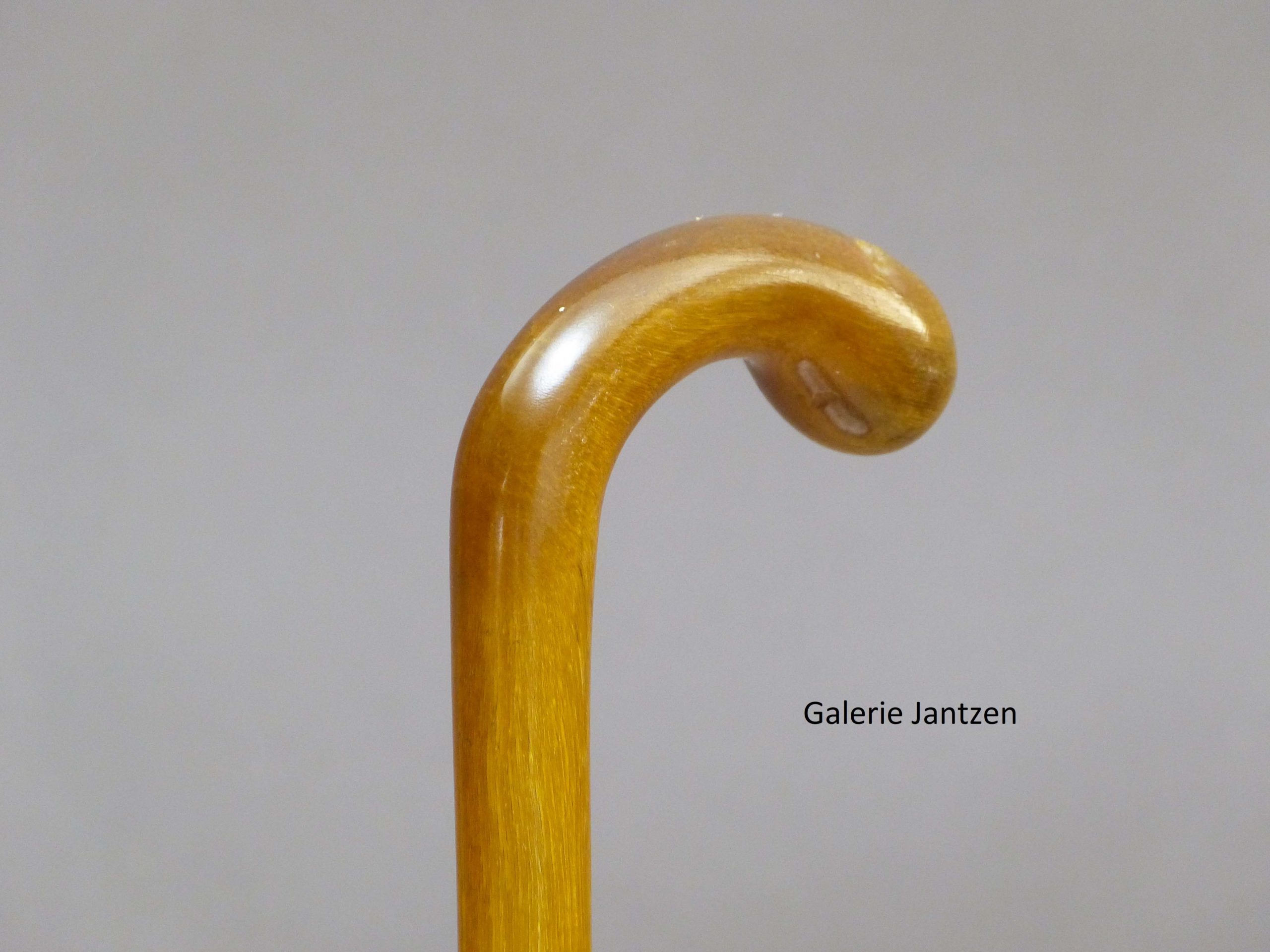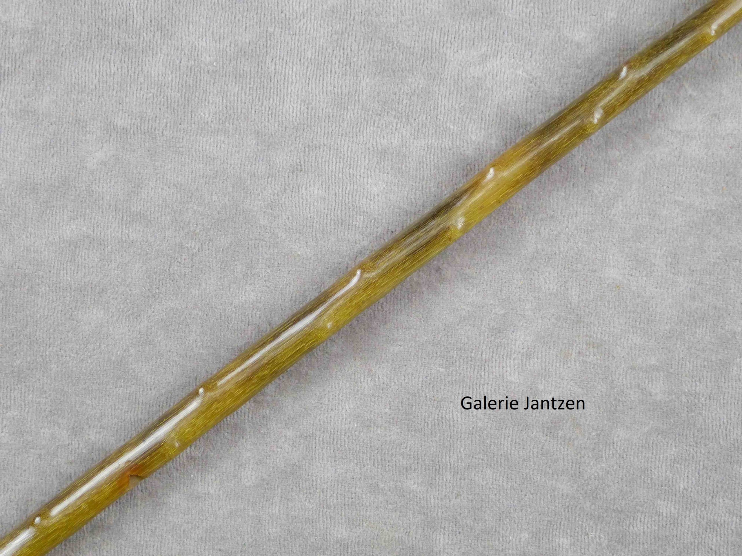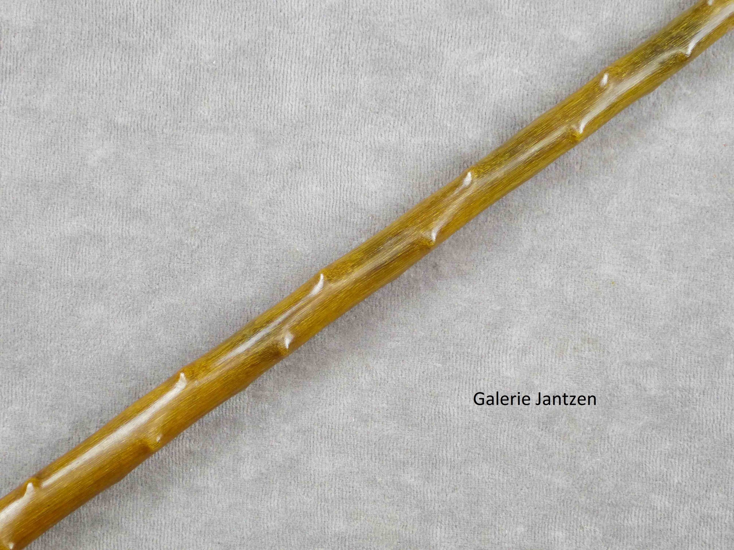 Canne monoxyle de forme conique et pommeau de forme Équerre en corne de Rhinocéros, sculptée façon épine. La canne est bien protégée dans son coffret d’origine en bois, gainé de tissu rouge, disposant de 4 crochets de fermeture sur la tranche.