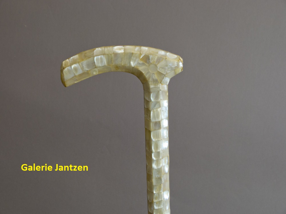 Canne de ville entièrement constituée de marqueterie de nacre. Le pommeau très important est de forme béquille à huit pans, le fût est également octogonal, férule métal.