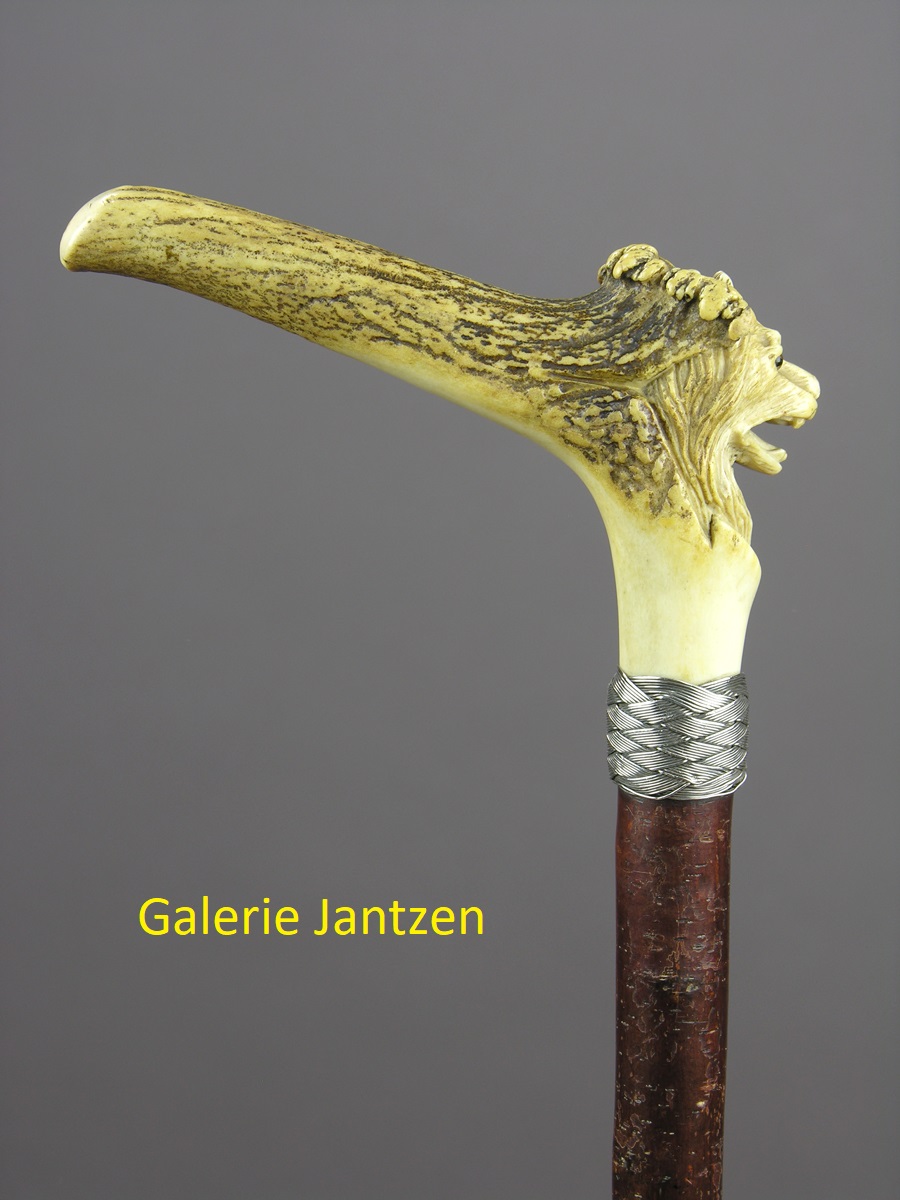 Canne de marche à poignée en andouiller sculptée d’une tête de chien. Il a des yeux de verre brun à pupilles noires. Sur une bague de fils d’argent tressés et un fût en merisier, férule métal.