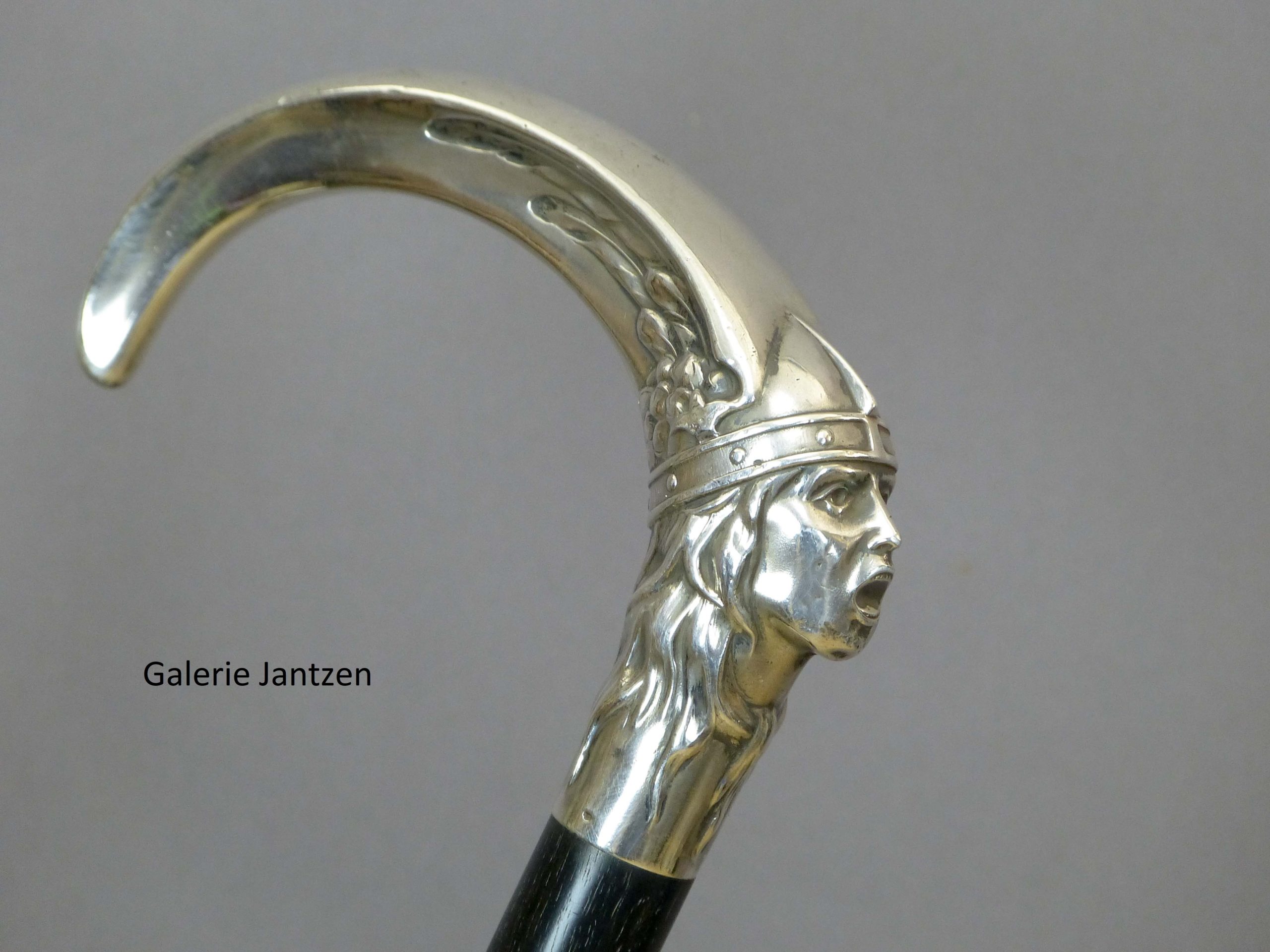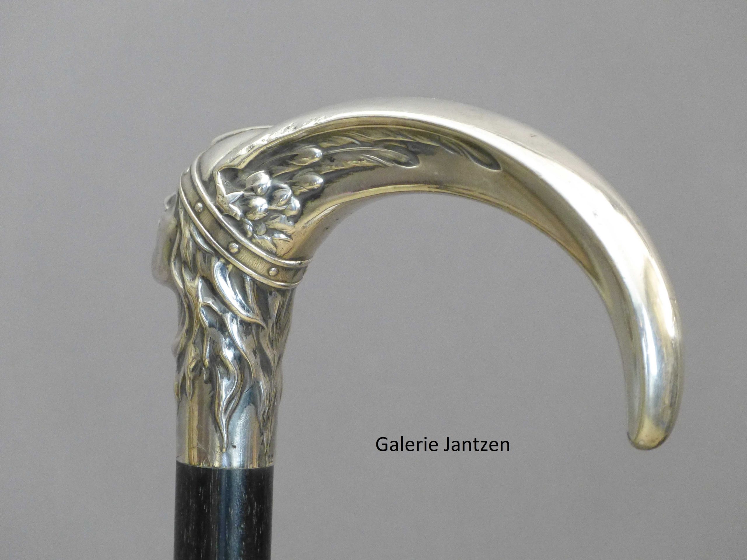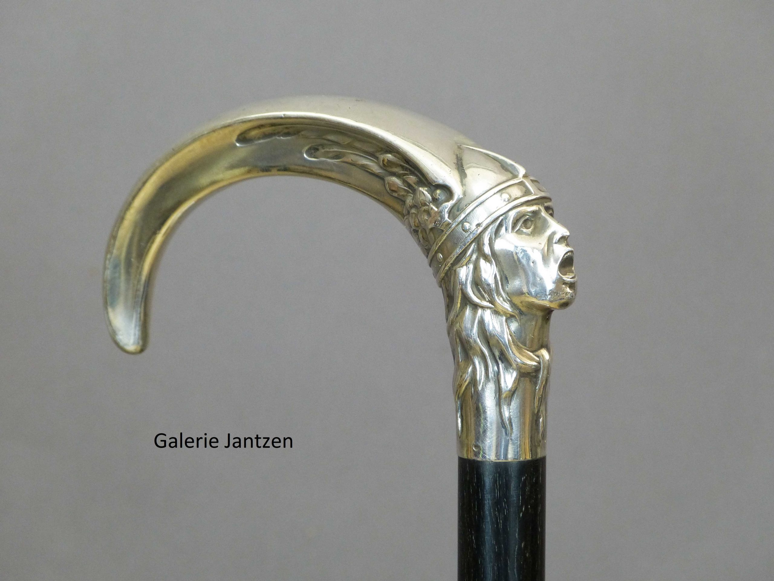 Courbe en argent sculptée de la tête d’un guerrier portant un casque de Gaulois prolongé par des plumes de chaque côtés. Le guerrier Gaulois aux cheveux longs ondulant sur sa nuque, a un foulard noué autour du cou et la bouche ouverte et semble appeler ses compagnons d’armes.