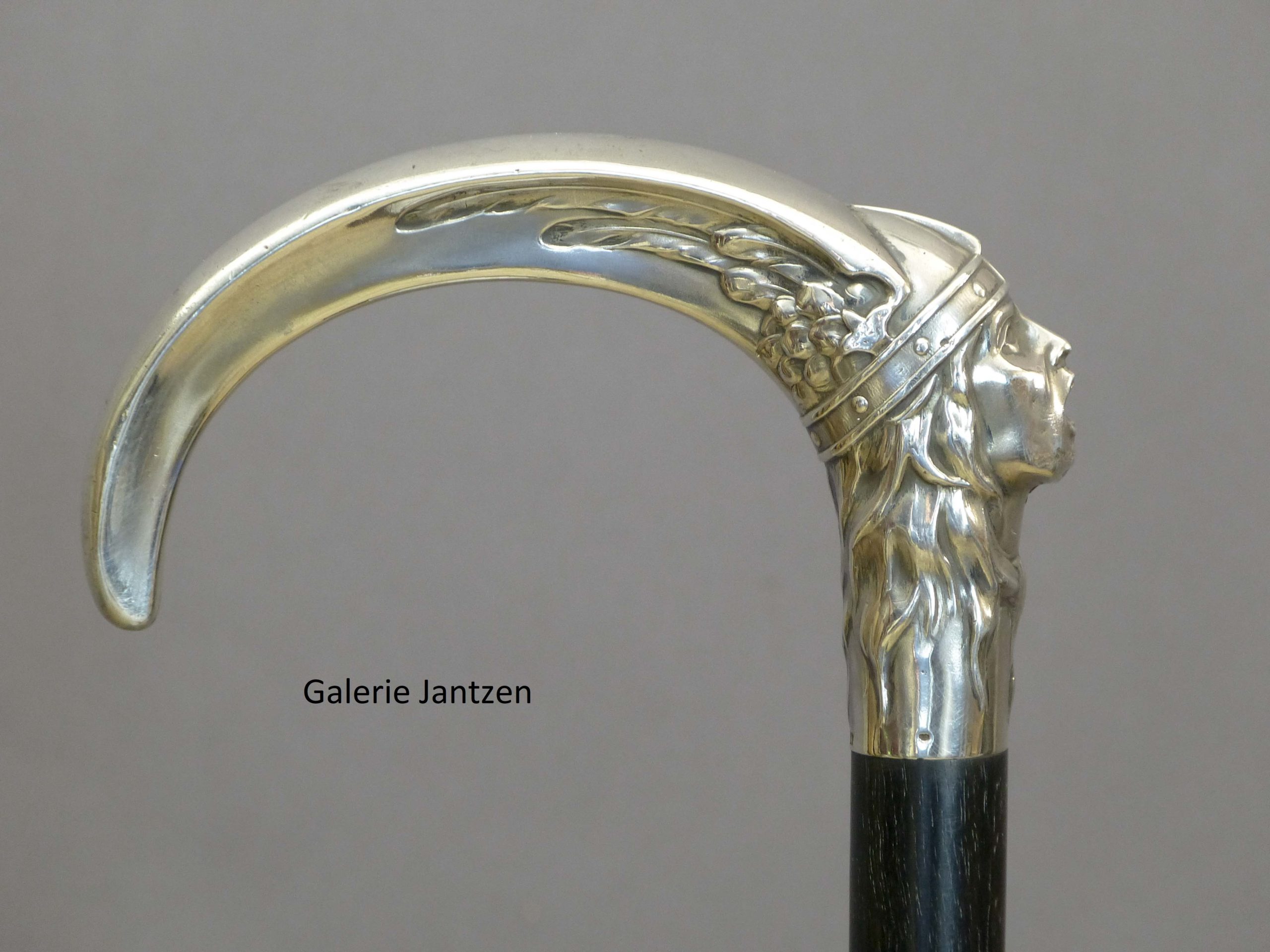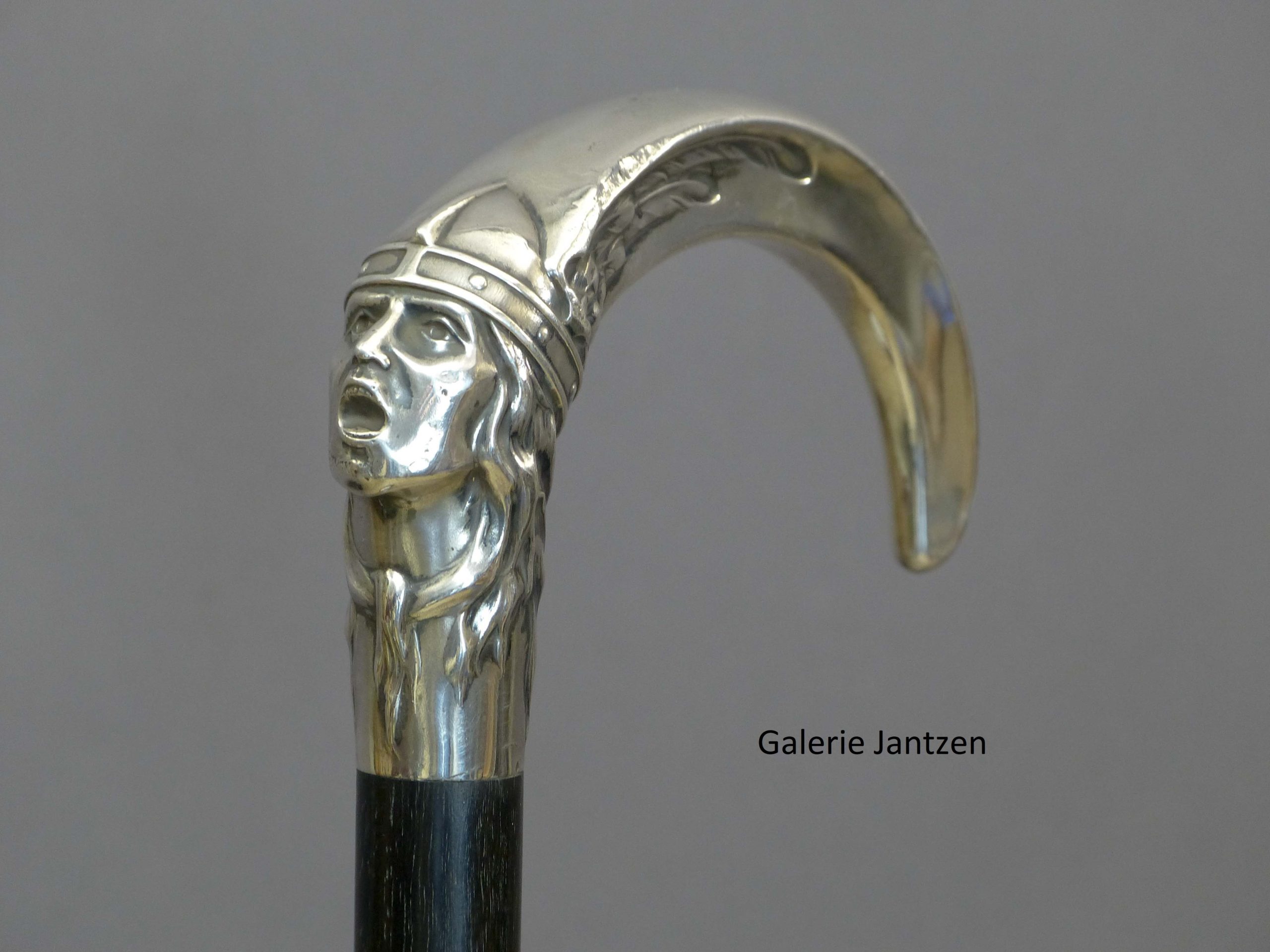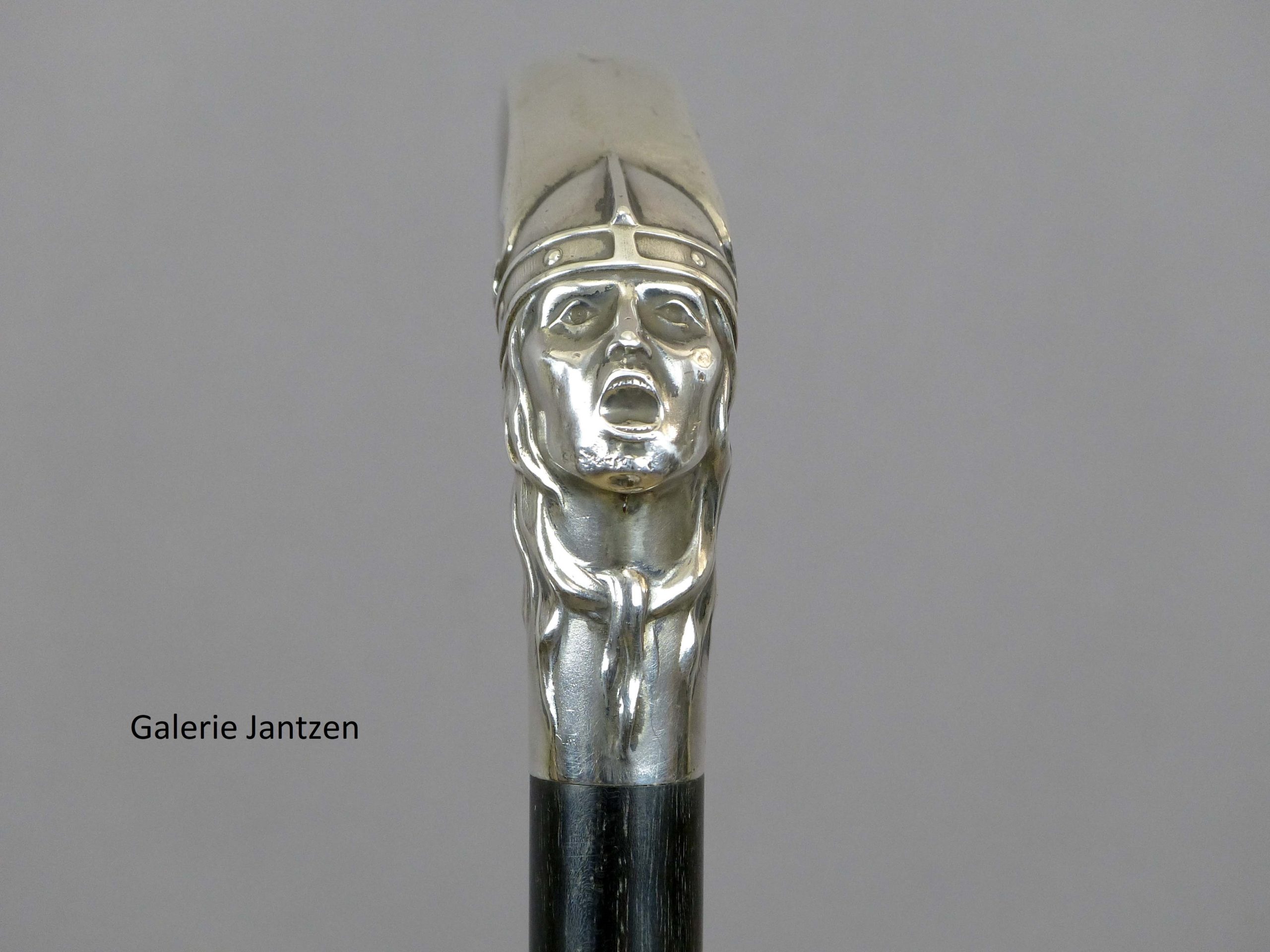 Courbe en argent sculptée de la tête d’un guerrier portant un casque de Gaulois prolongé par des plumes de chaque côtés. Le guerrier Gaulois aux cheveux longs ondulant sur sa nuque, a un foulard noué autour du cou et la bouche ouverte et semble appeler ses compagnons d’armes.