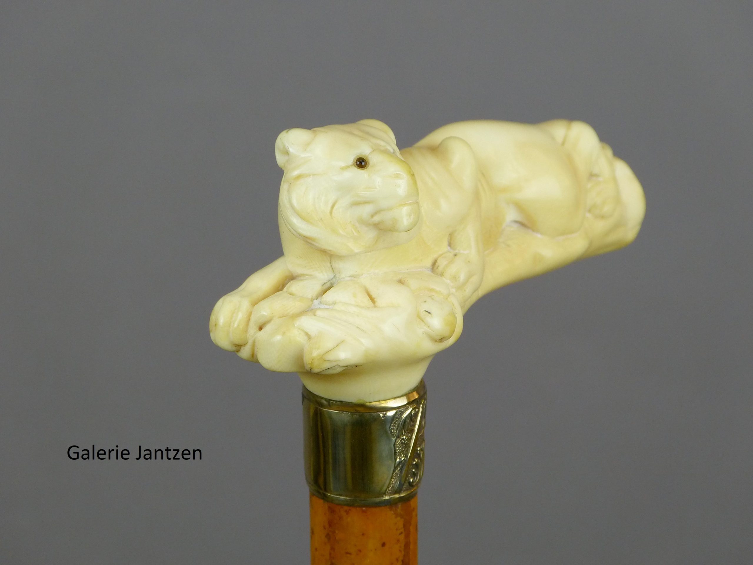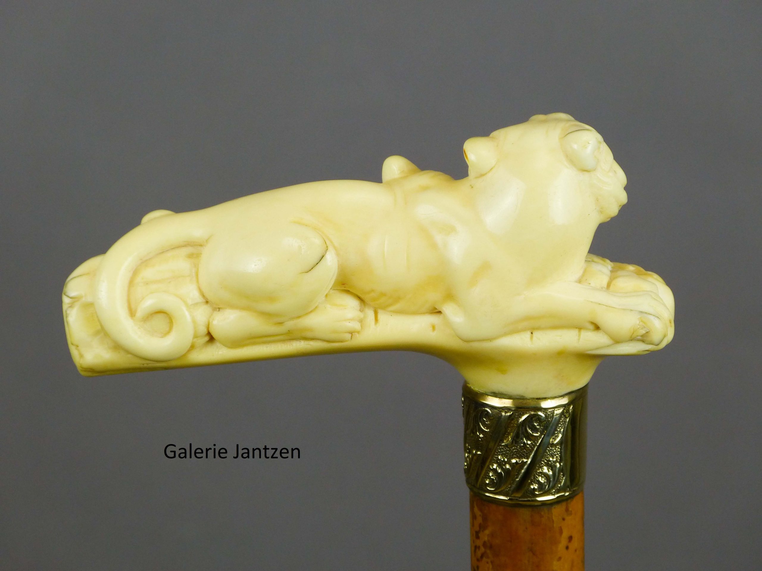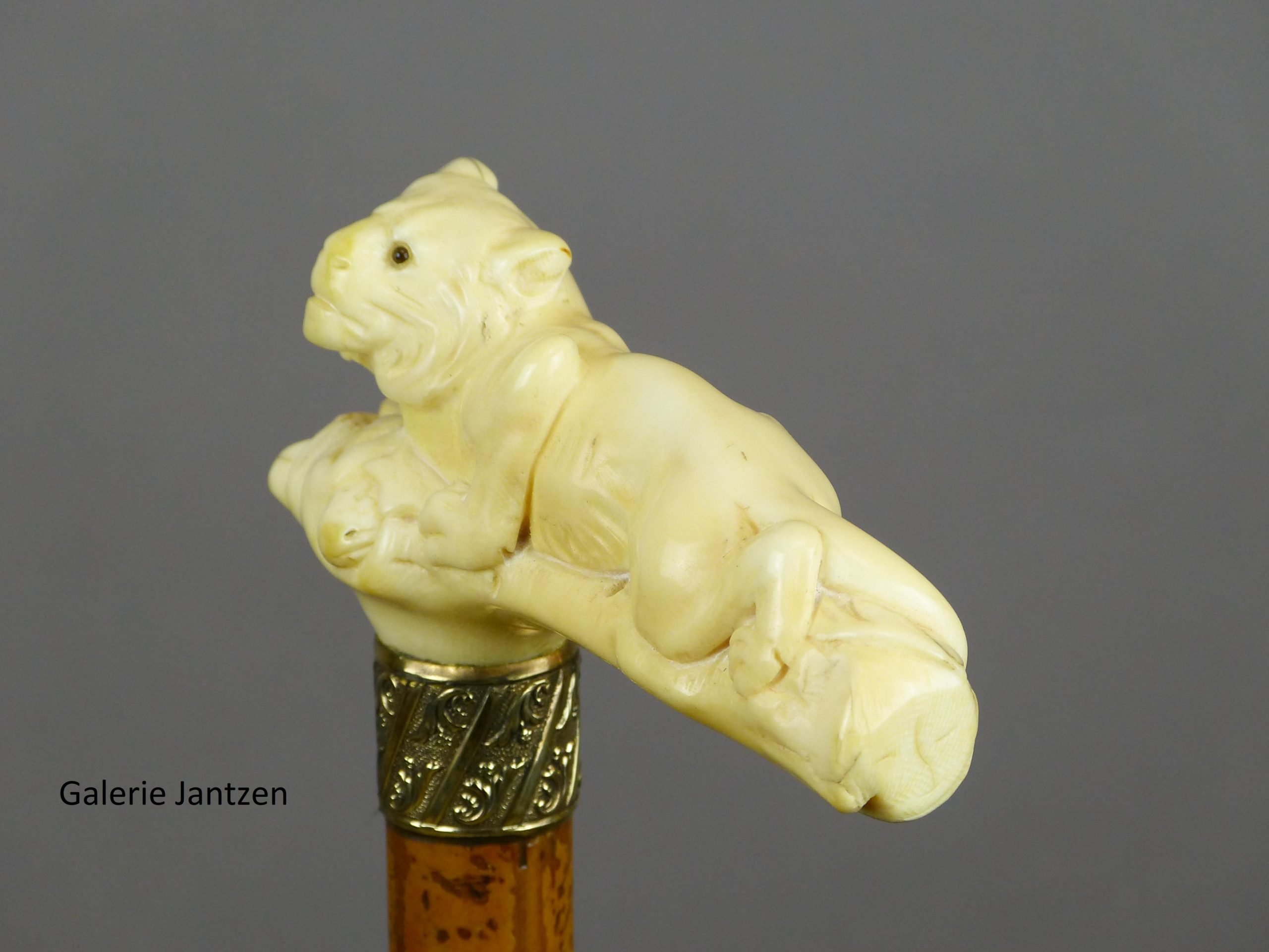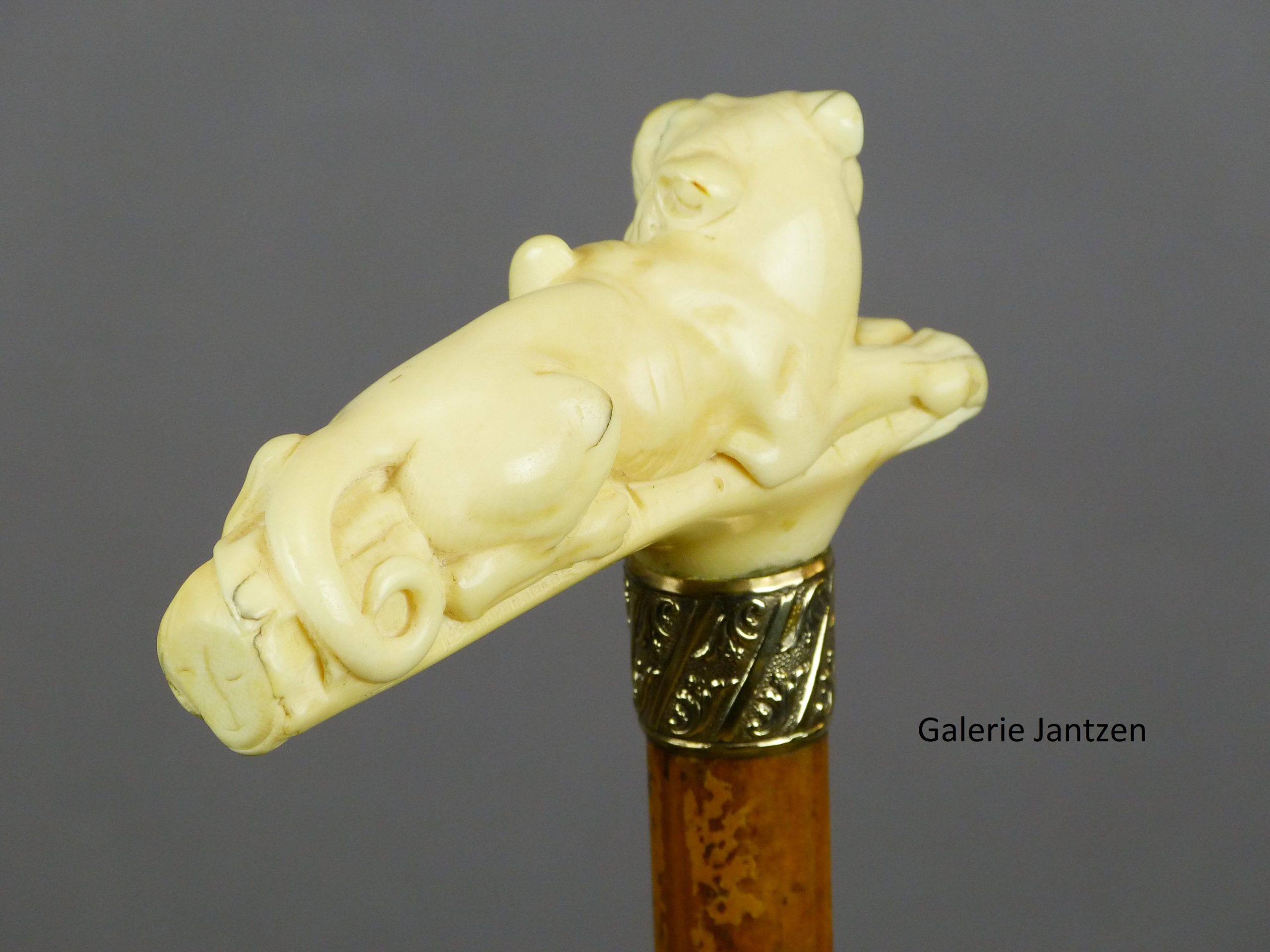 Canne animalière dont le pommeau est sculpté d’une lionne couchée sur un tronc de bois, regardant sur son coté gauche. Ses yeux marrons sont en verre, sur son flanc droit, elle semble détendue, les pattes allongées en position de repos, contrastant avec son flanc gauche où elle semble prête à bondir avec les pattes repliées.