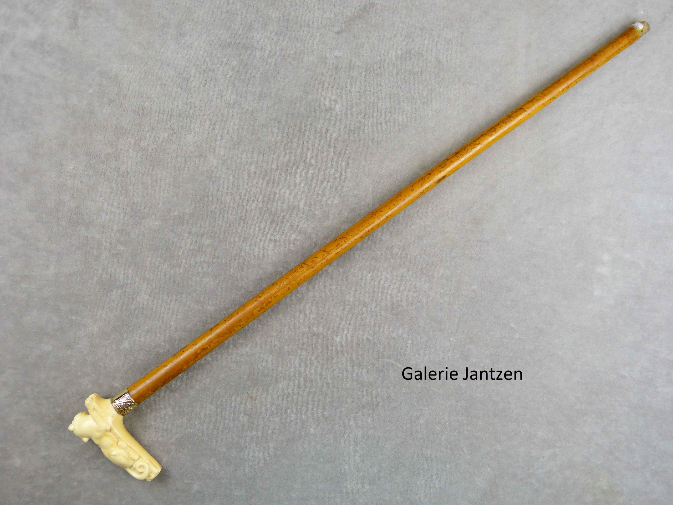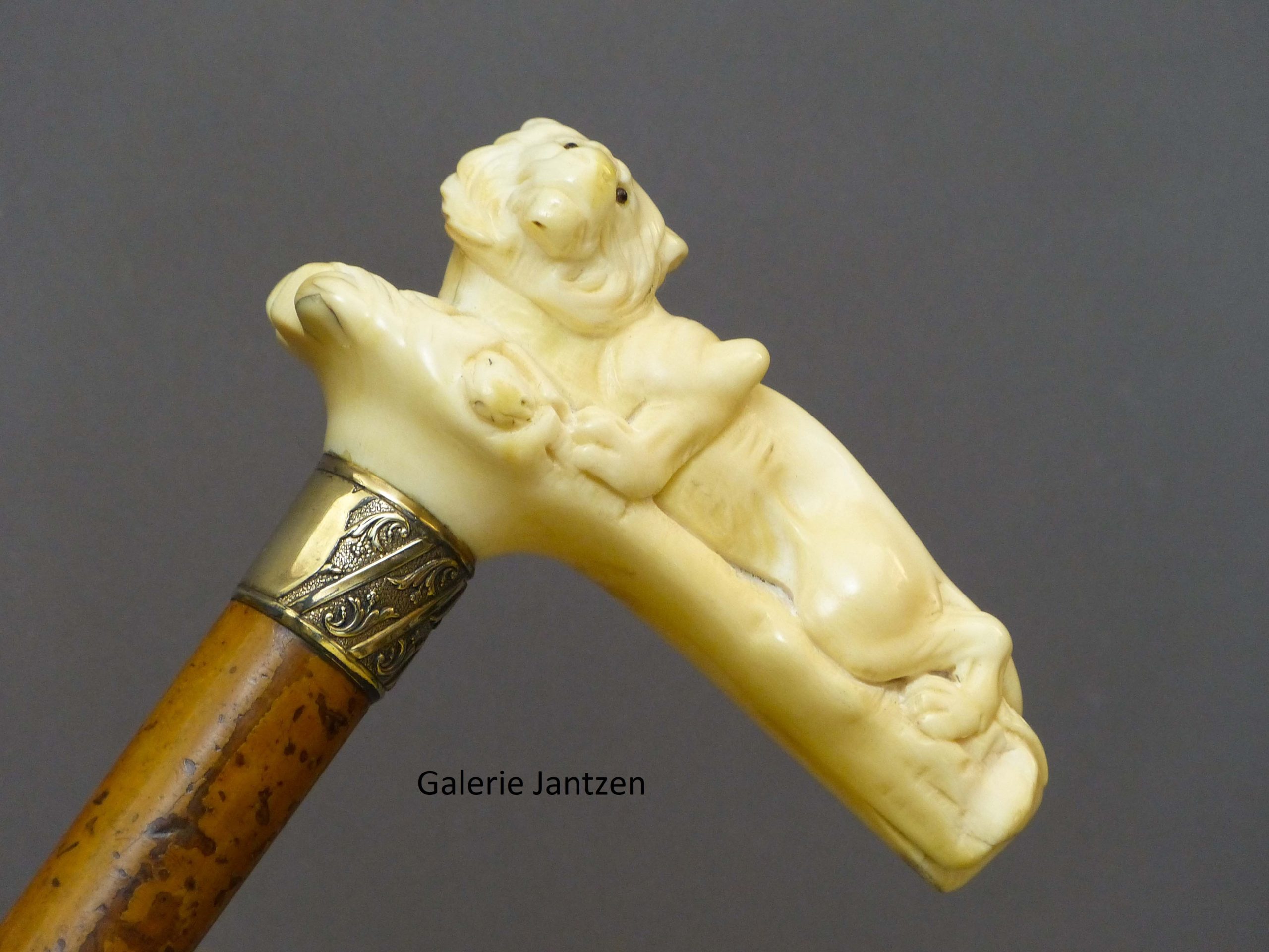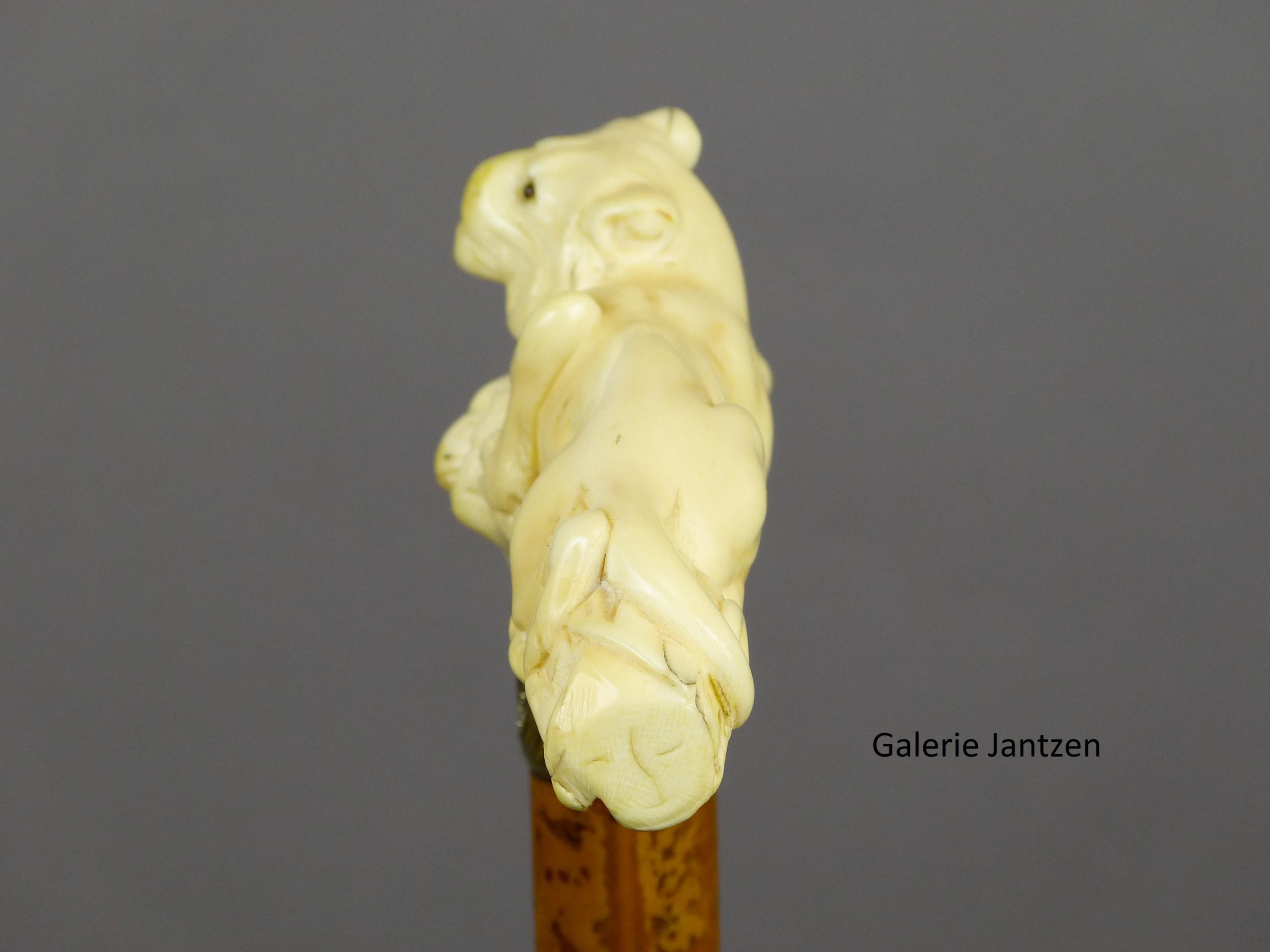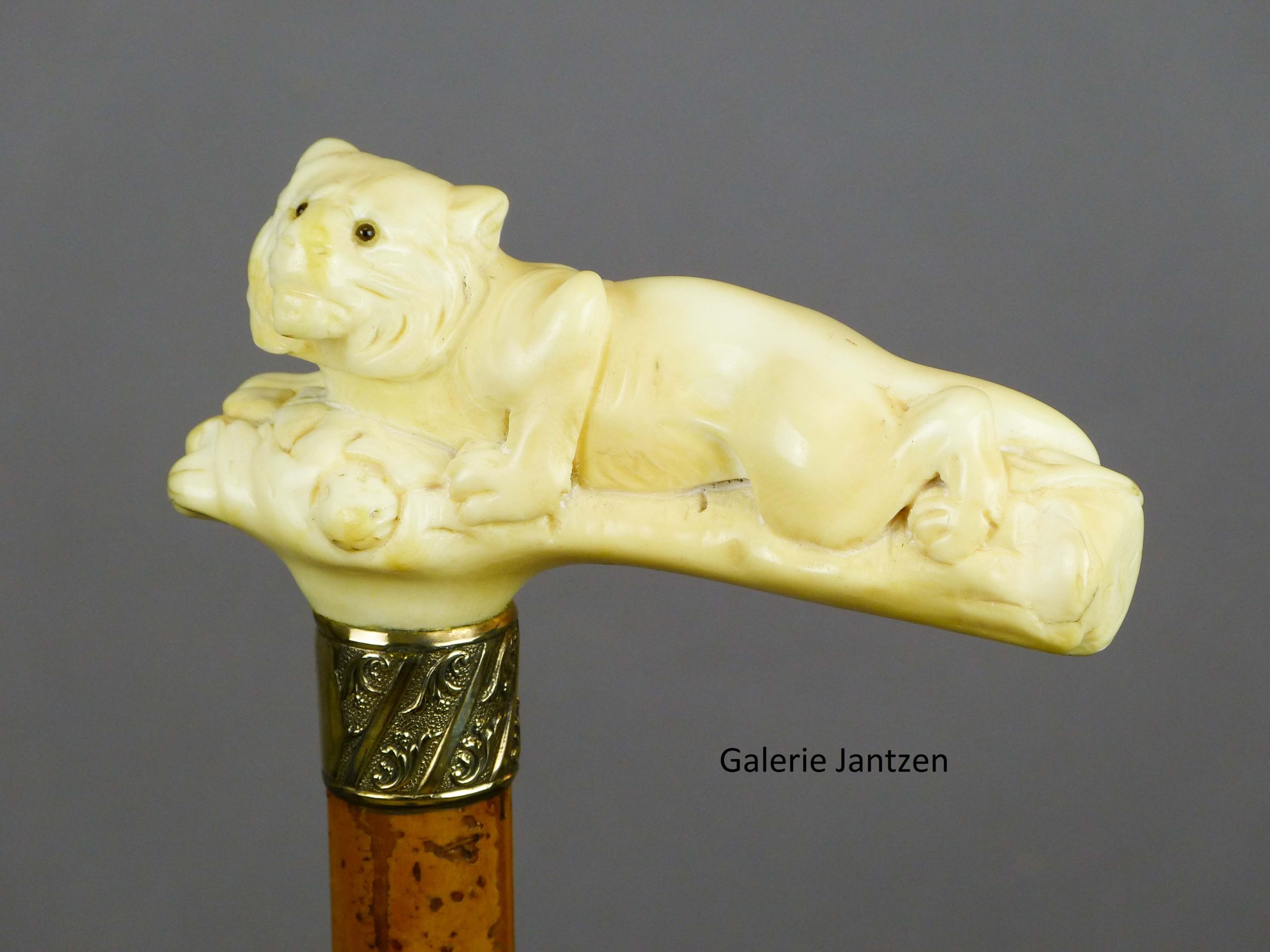 Canne animalière dont le pommeau est sculpté d’une lionne couchée sur un tronc de bois, regardant sur son coté gauche. Ses yeux marrons sont en verre, sur son flanc droit, elle semble détendue, les pattes allongées en position de repos, contrastant avec son flanc gauche où elle semble prête à bondir avec les pattes repliées.