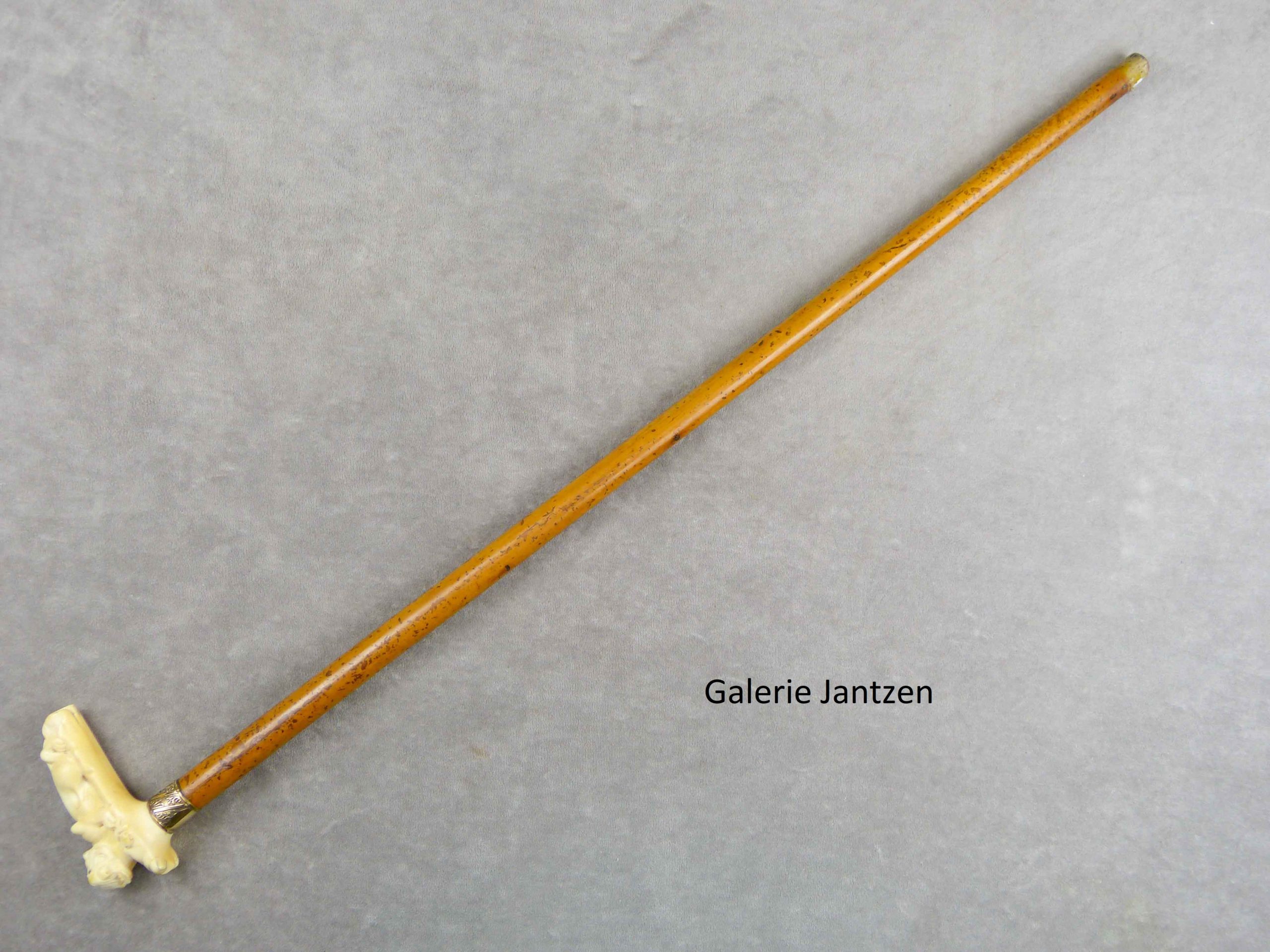 Le pommeau est monté sur une bague ciselée en vermeil avec un cartouche sans initiales et sur un fût en jonc de Malacca, férule en corne.