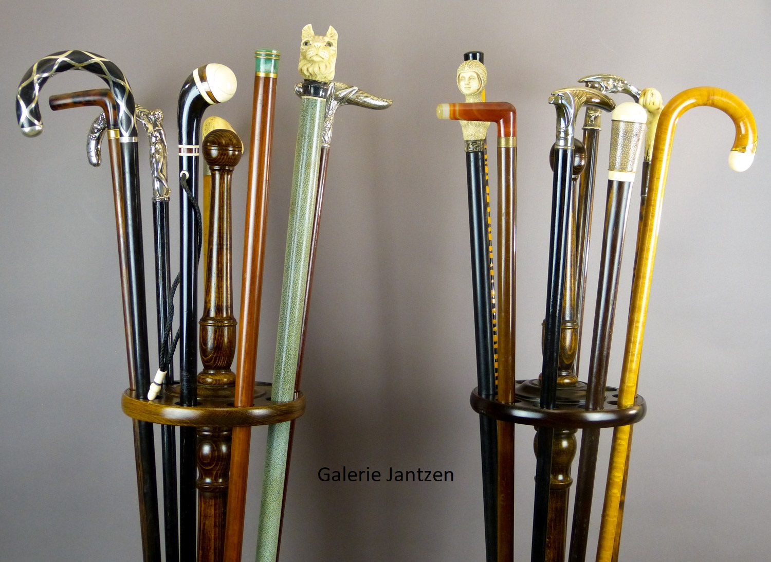 Paire de présentoir en bois sur axe central, reposant sur trépied et permettant d’accueillir 10 cannes chacun. De la feutrine verte sur la plateforme du bas permet de ne pas abimer ni le bout des cannes, ni le présentoir.