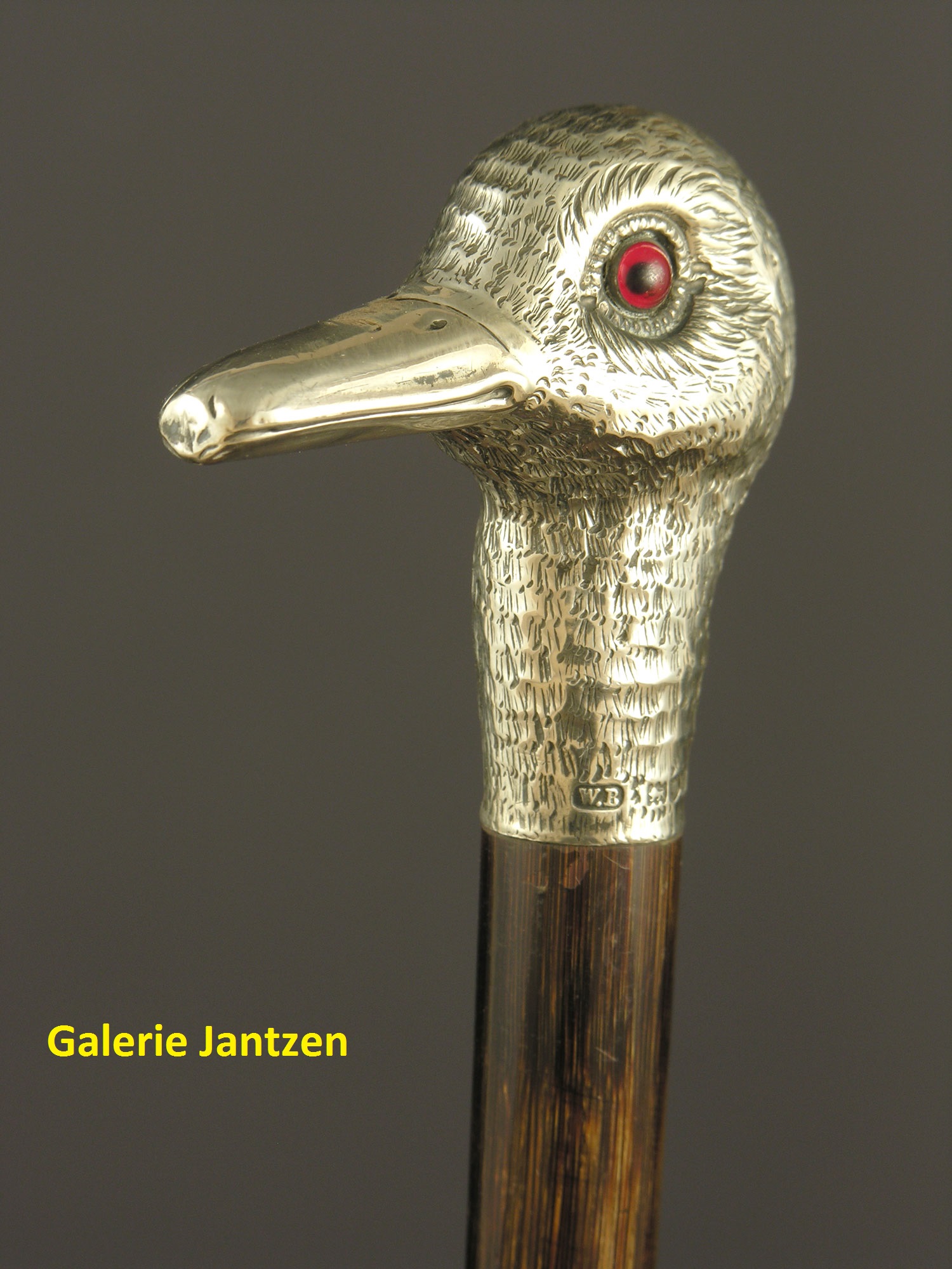 Canne de ville à poignée en argent sculptée d’une tête de canard ciselée entièrement de plumes. Il a des yeux de verre rouge à pupilles noires.