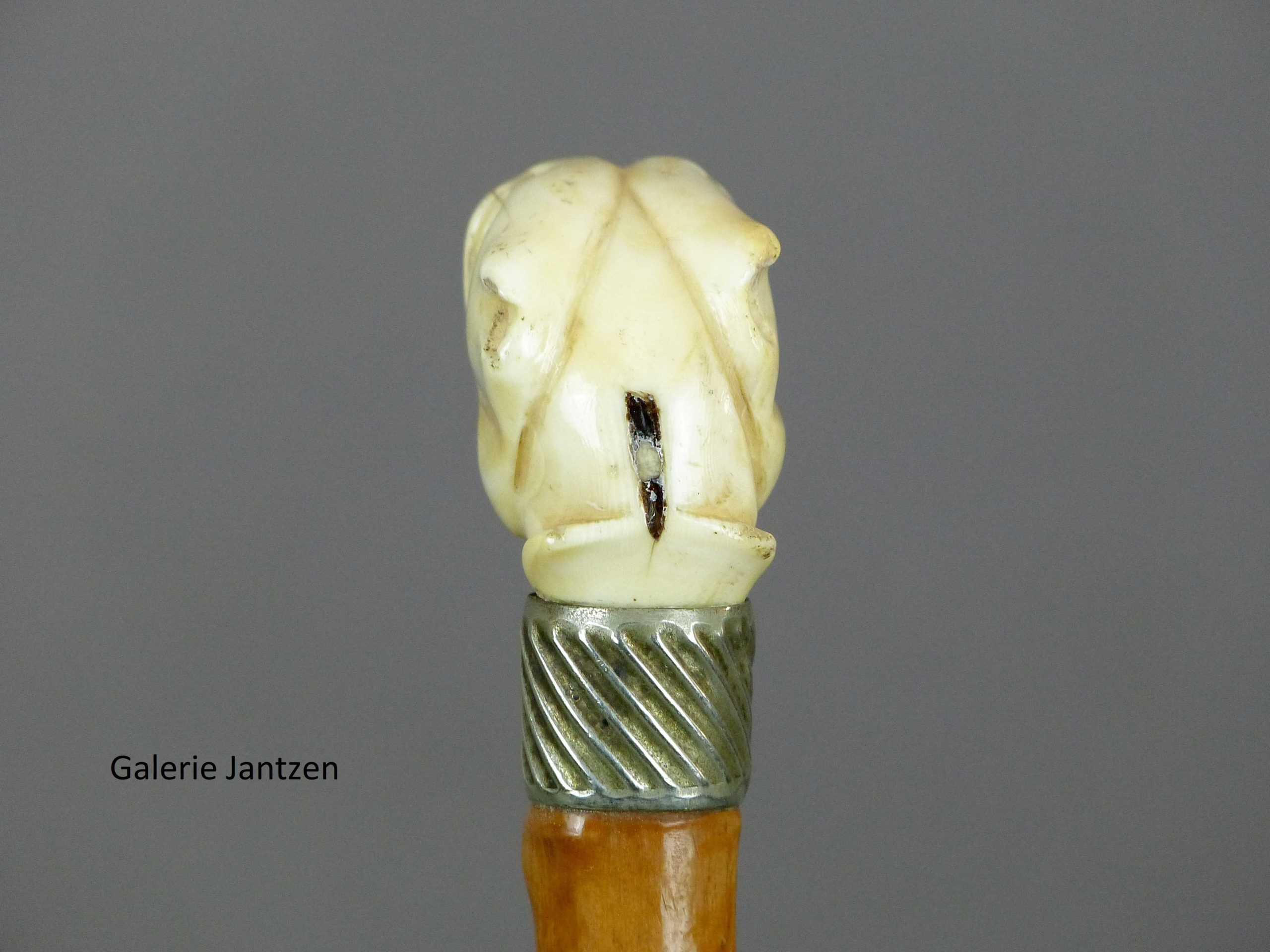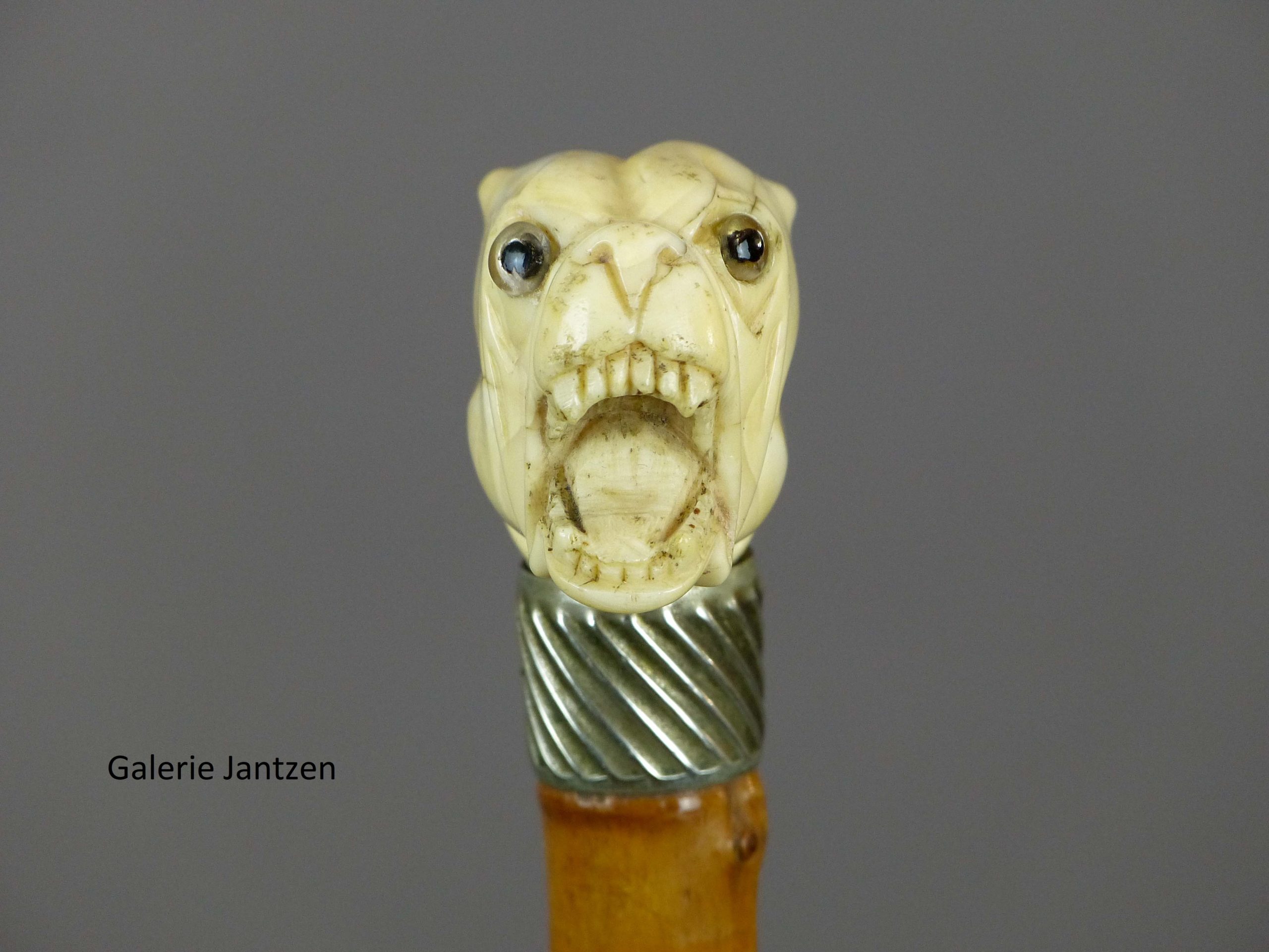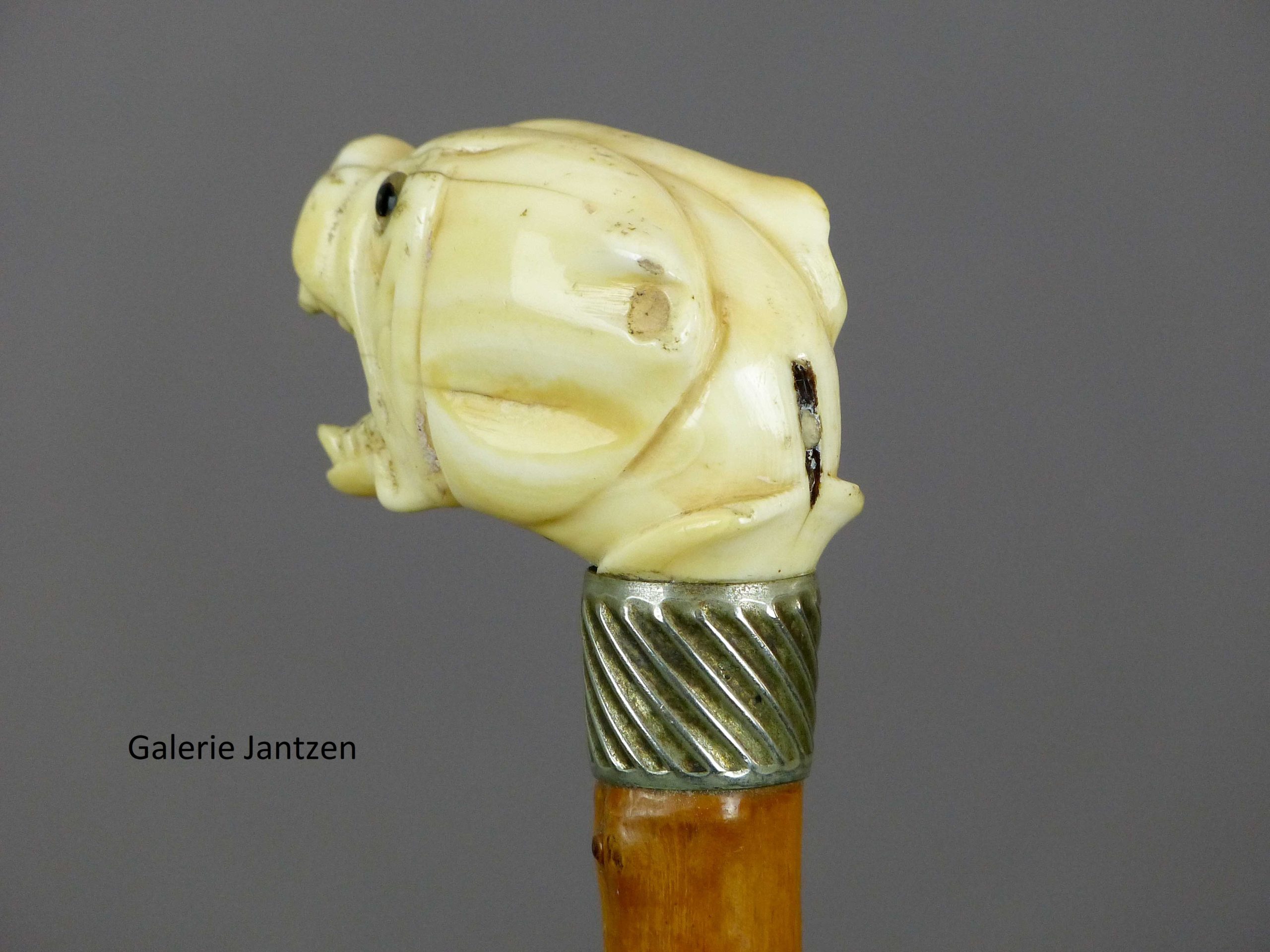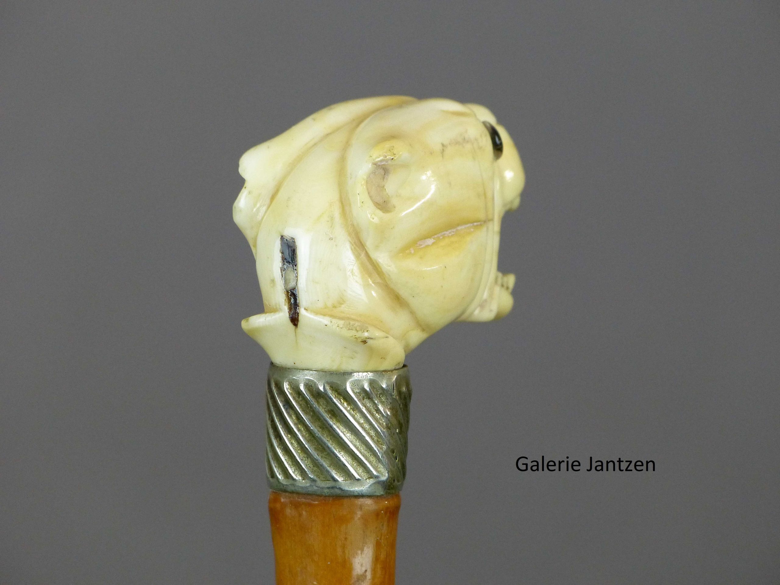 Canne décorative dont le pommeau est sculpté d’une petite tête de dogue en ivoire, gueule ouverte et menaçante. Ses yeux sont en verre.