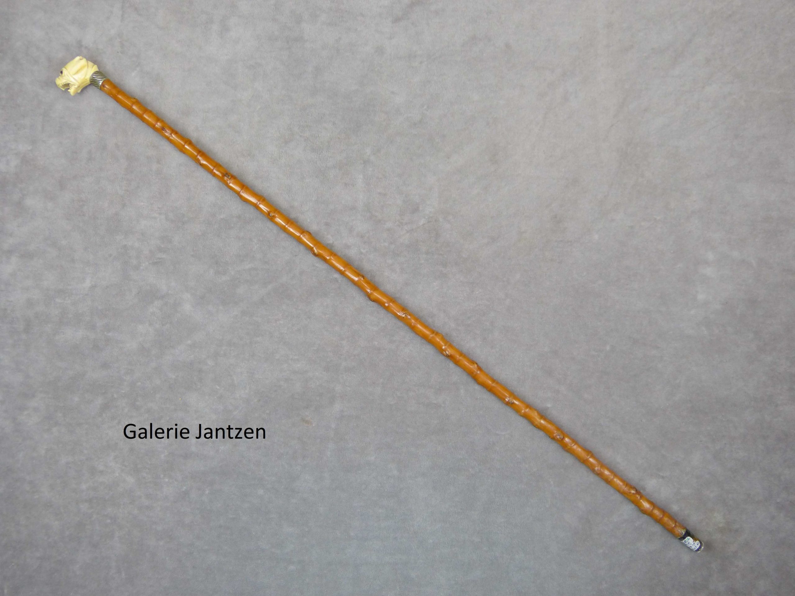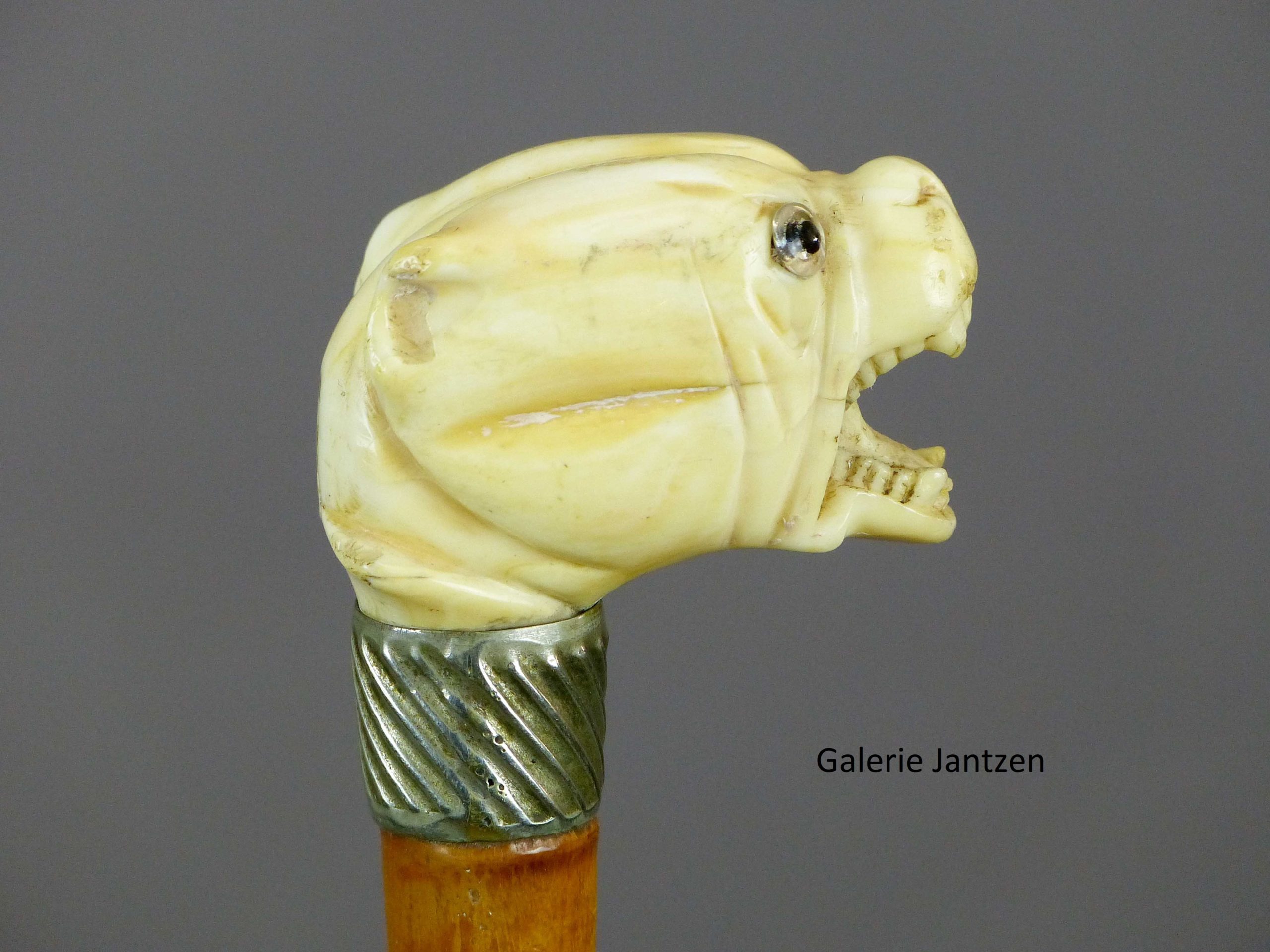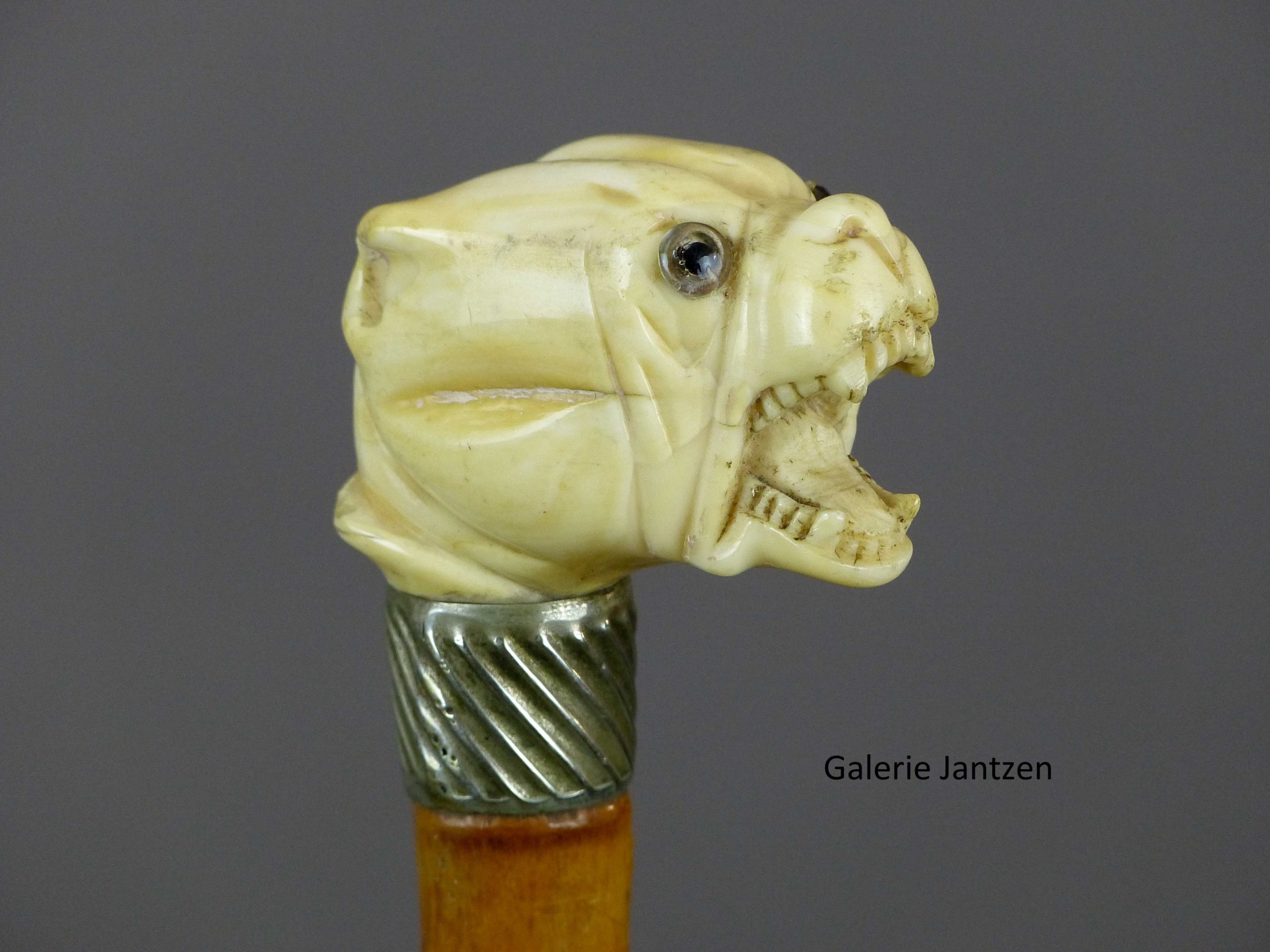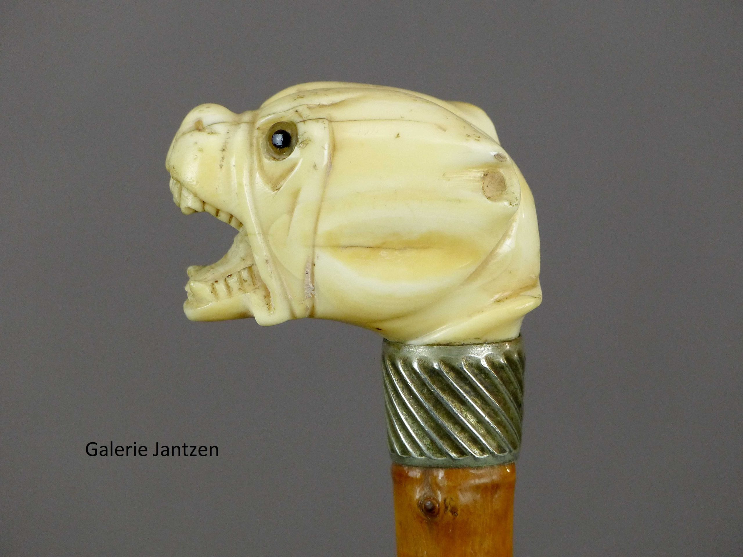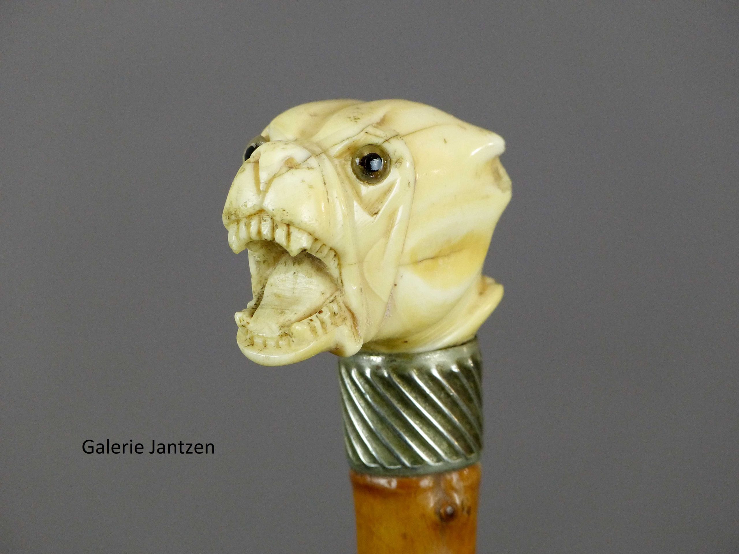 Canne décorative dont le pommeau est sculpté d’une petite tête de dogue en ivoire, gueule ouverte et menaçante. Ses yeux sont en verre.