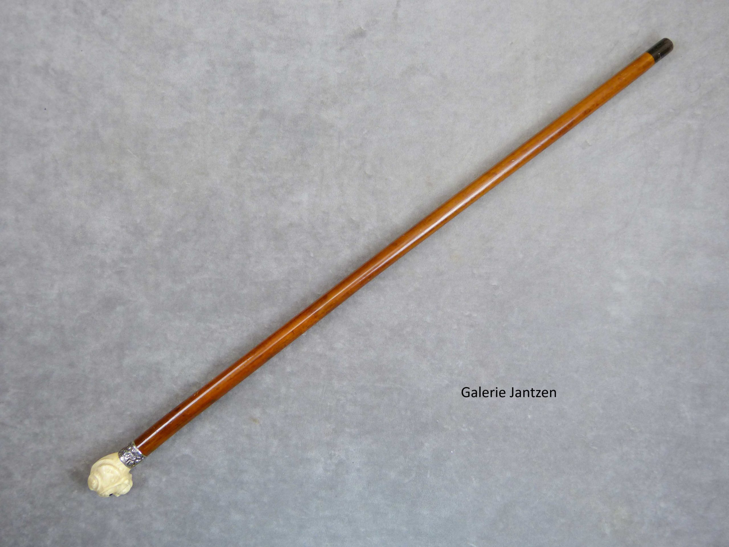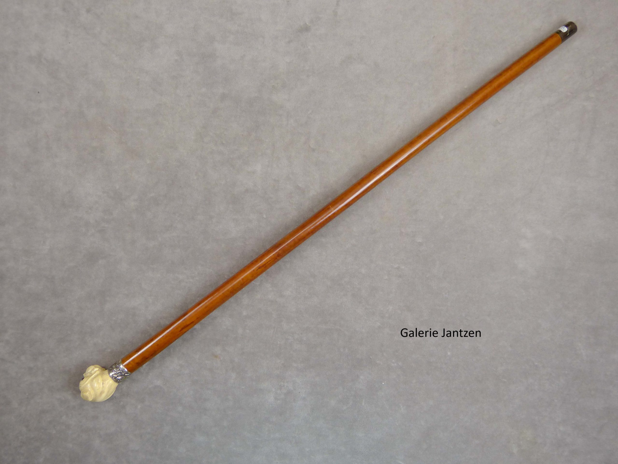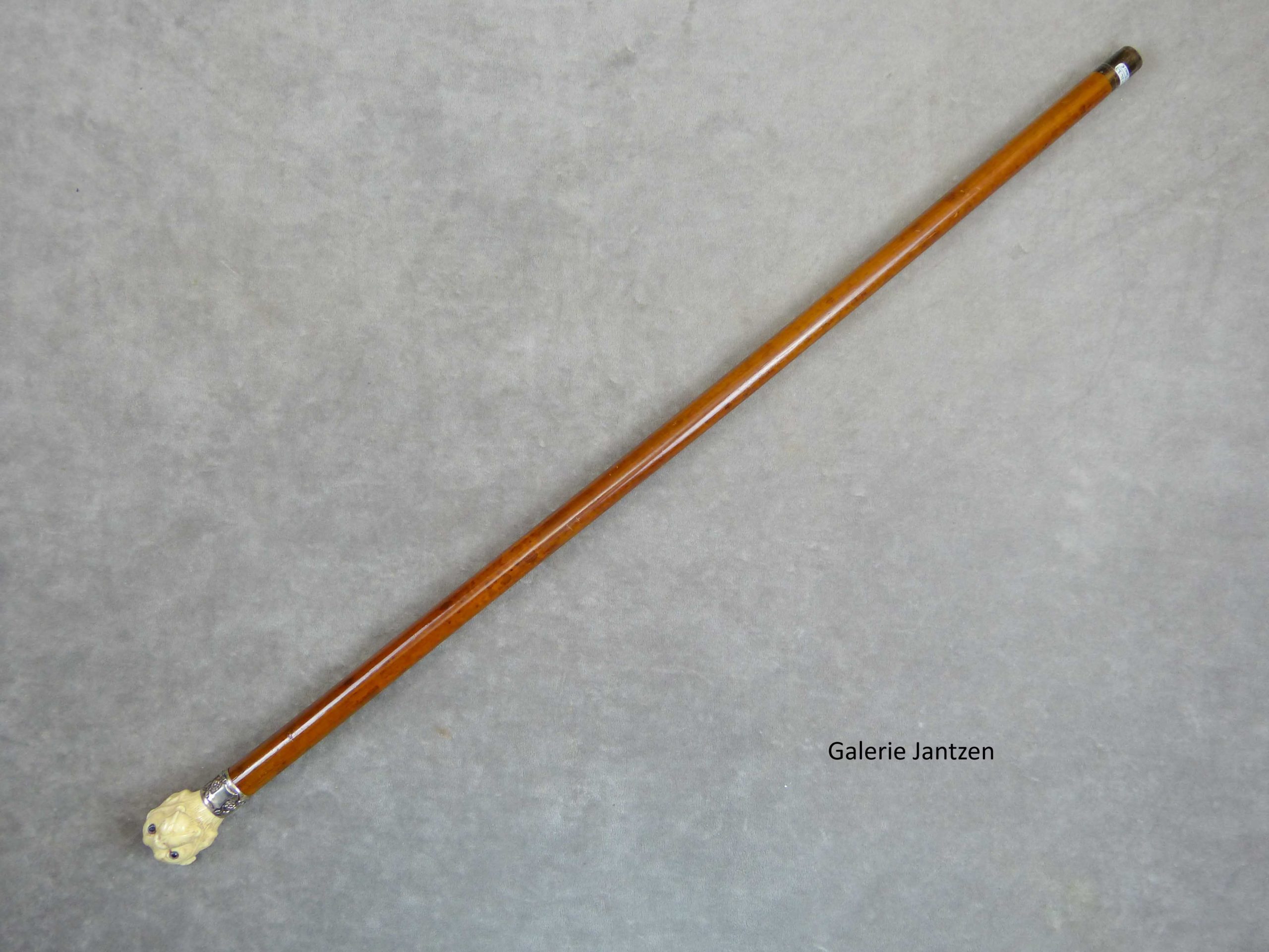Canne décorative à pommeau en ivoire sculpté d’une tête de dogue qui a l’air gentil. Il a les oreilles rabattues, la gueule fermée et des yeux de verre à pupilles noires.
